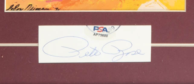 Custom framed display measures approximately 12" x 14" in size and features a cut that has been hand-signed by Pete Rose (D. 2024, Cincinnati Reds) and a print from Leroy Neiman (D. 2012).
