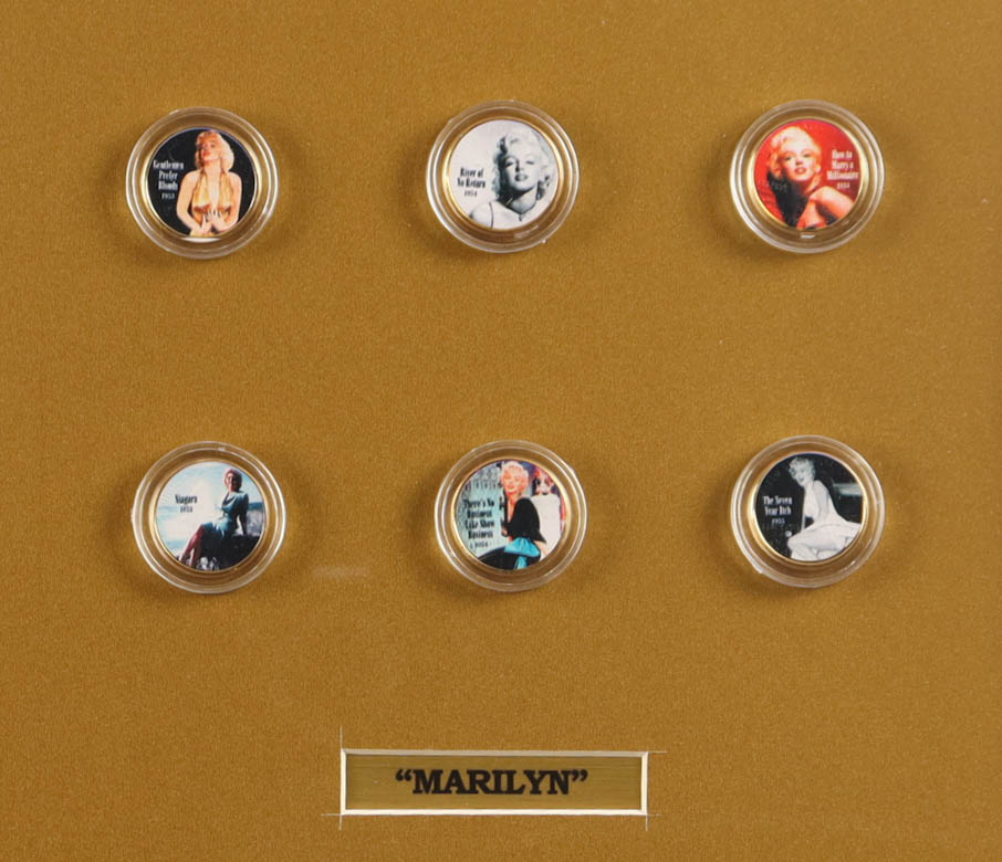 Custom framed display measures approximately 17" x 26" in size and features a photo of Marilyn Monroe. The display also includes (6) movie coins. Please note that the item is unsigned.