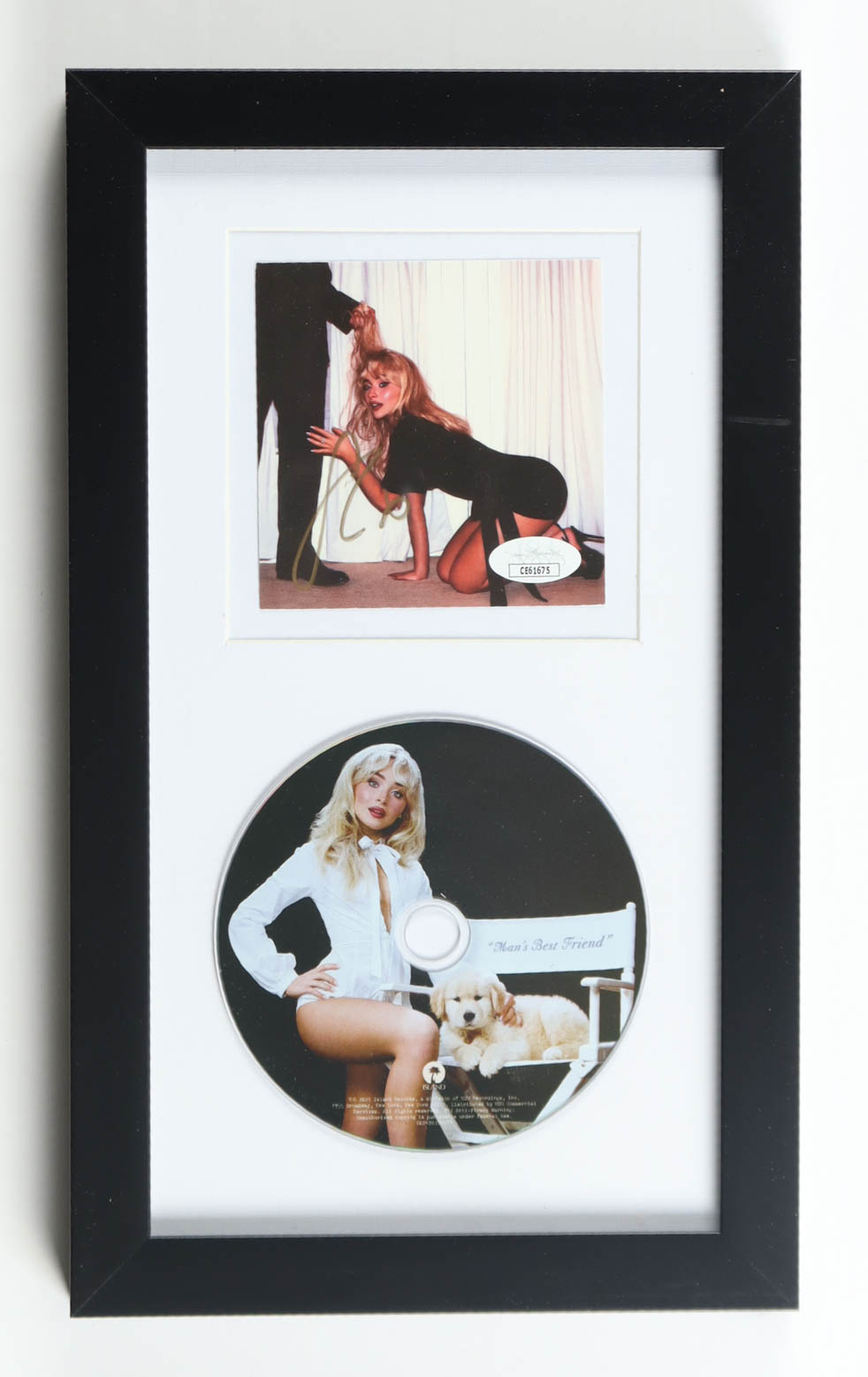 Custom frame measures approximately 8" x 13.5" in size. Features a "Man's Best Friend" CD insert that has been hand-signed by Sabrina Carpenter and includes the disc as shown. Please note, there is scuffing throughout the frame.