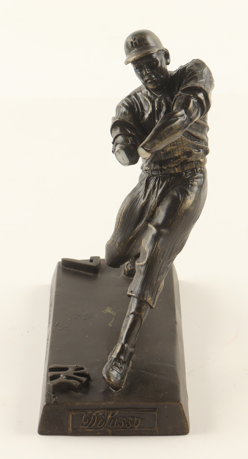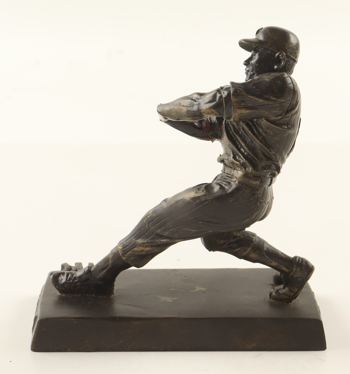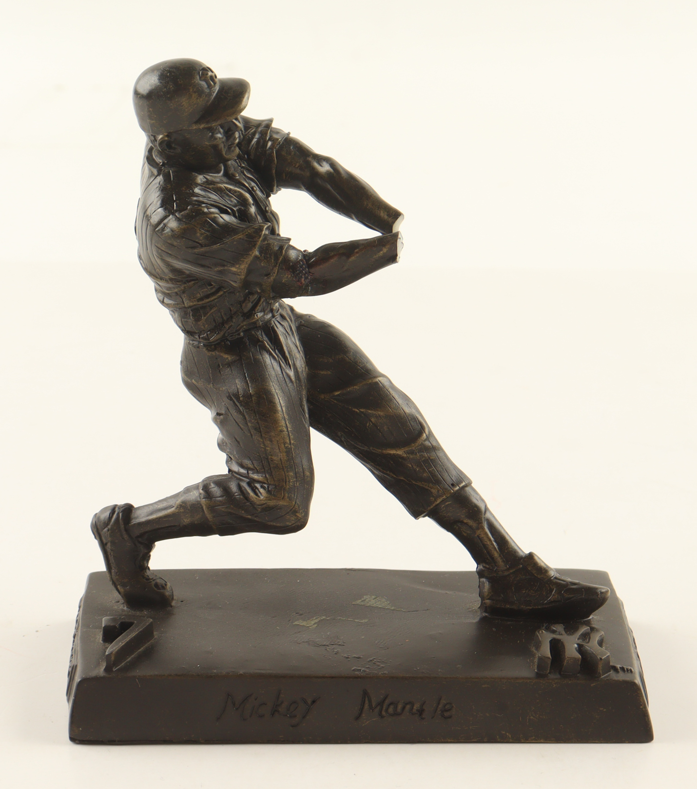 Replica bronzed figurine measures approximately 6" tall of Mickey Mantle (D. 1995, New York Yankees, HOF). Please note that the item is unsigned, does come in the original packaging and shows signs of damage.