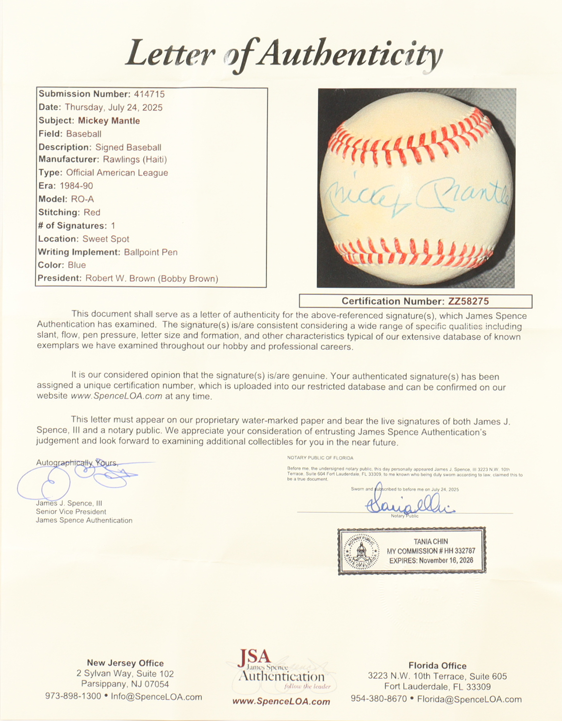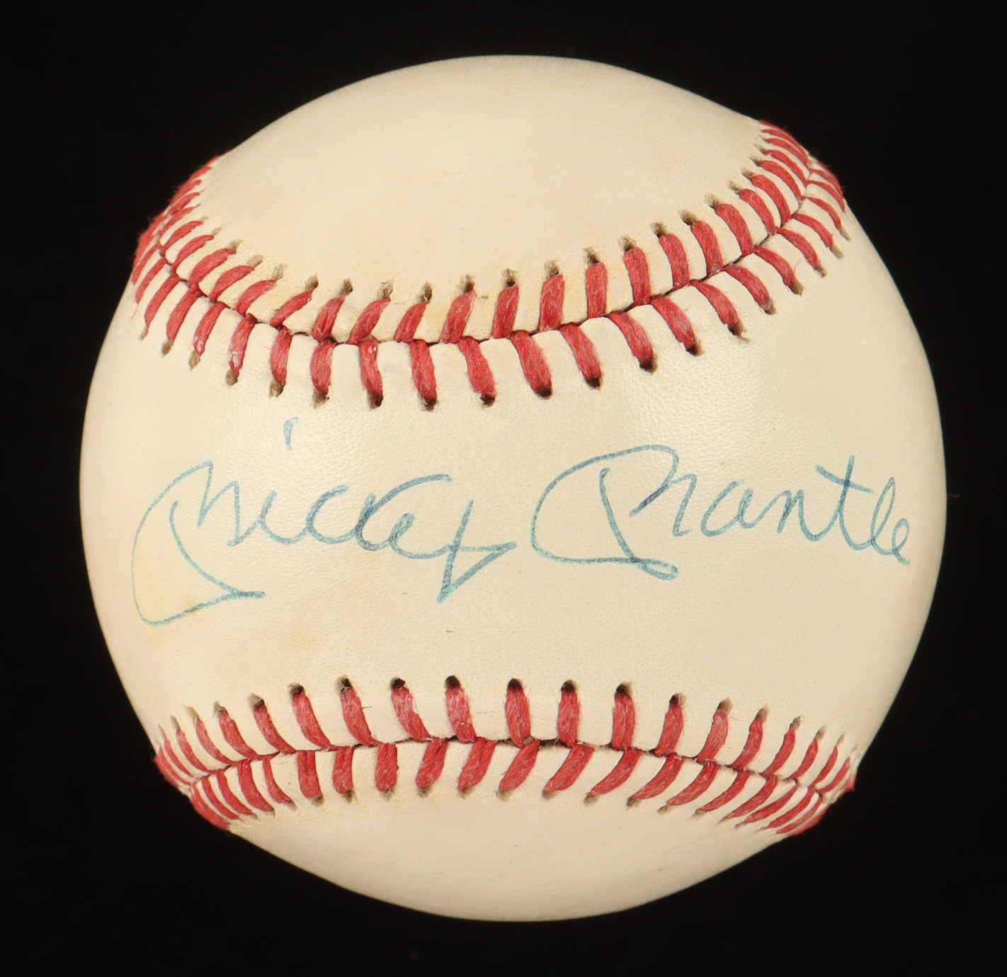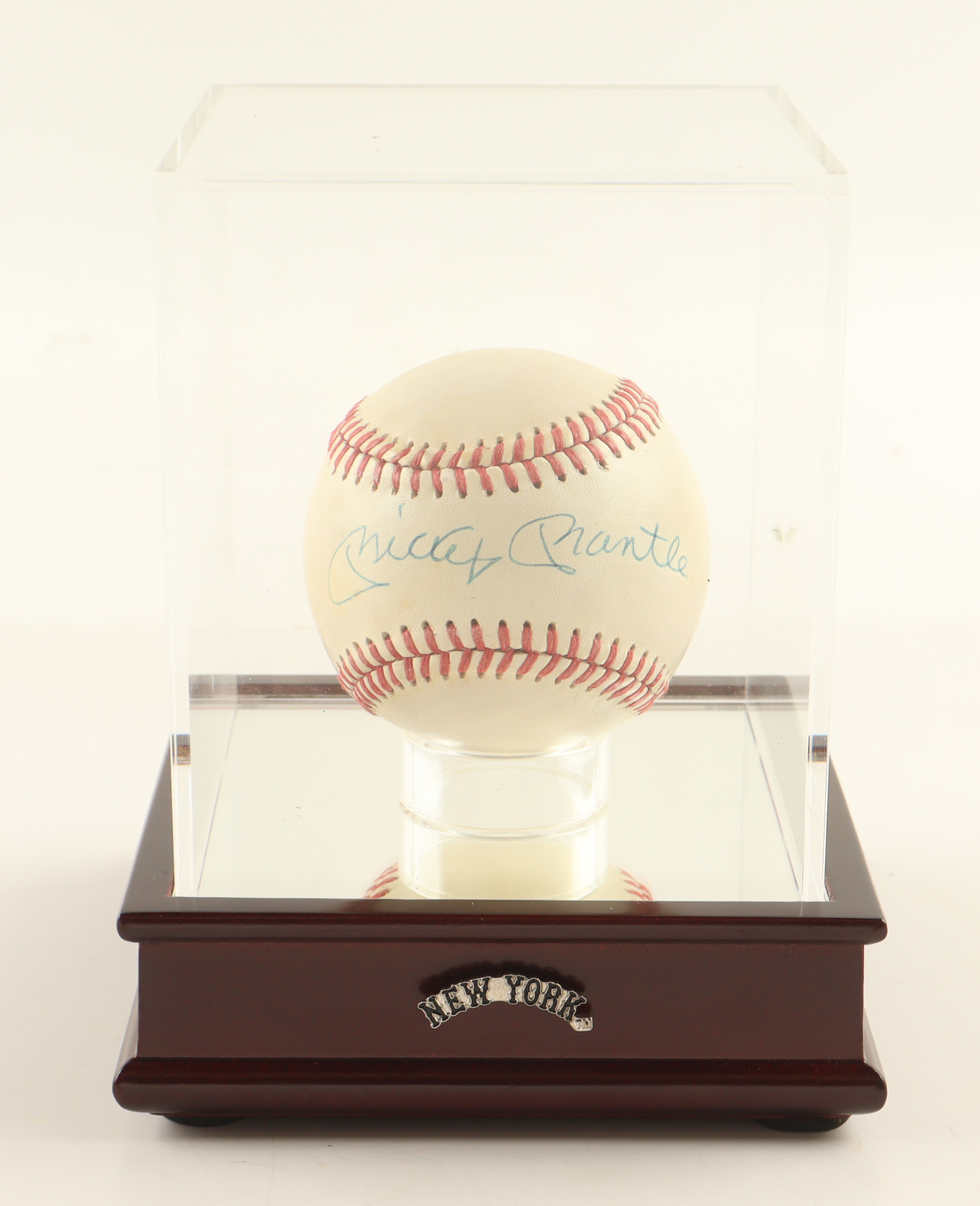 Rawlings Official American League Baseball. Hand-signed by Mickey Mantle (D. 1995, New York Yankees, HOF). Please note, the display case is included in the listing as shown above.