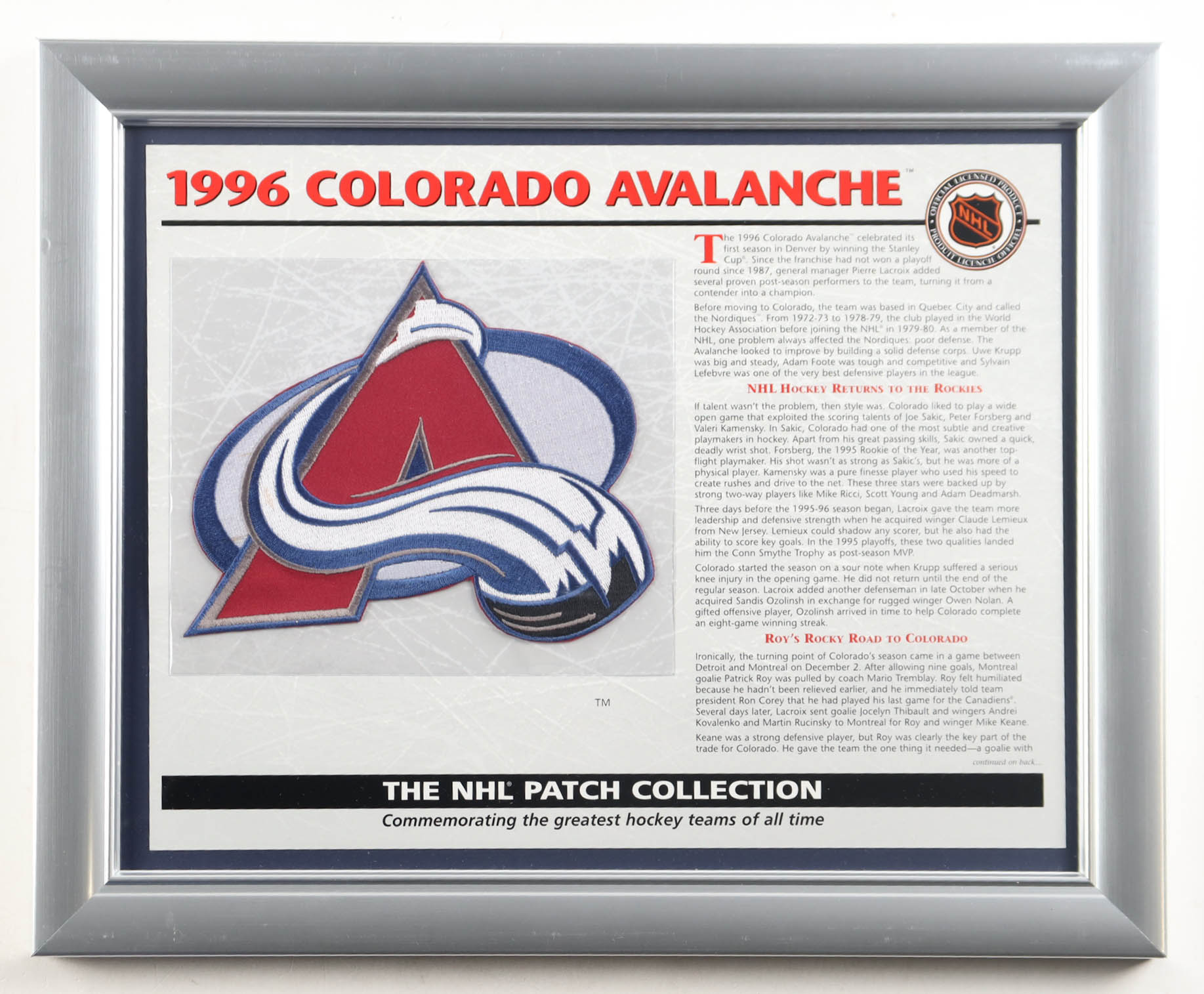 Custom frame measures approximately 13" x 16" in size. The display features a 1996 Colorado Avalanche Commemorative Stat and Patch Card. Please note that the item is unsigned.