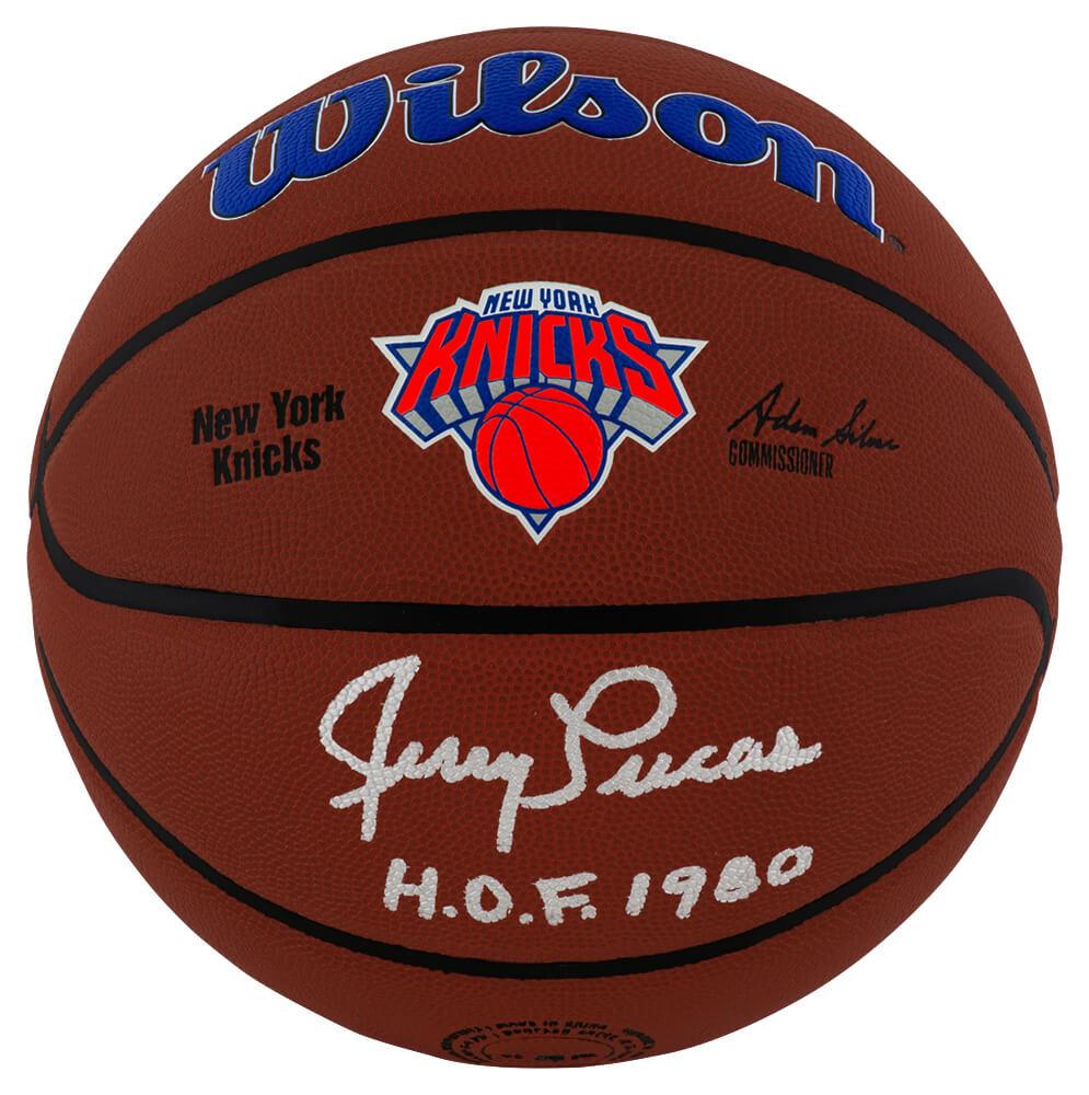 Wilson NBA New York Knicks logo basketball has been hand-signed and inscribed by Jerry Lucas (HOF).