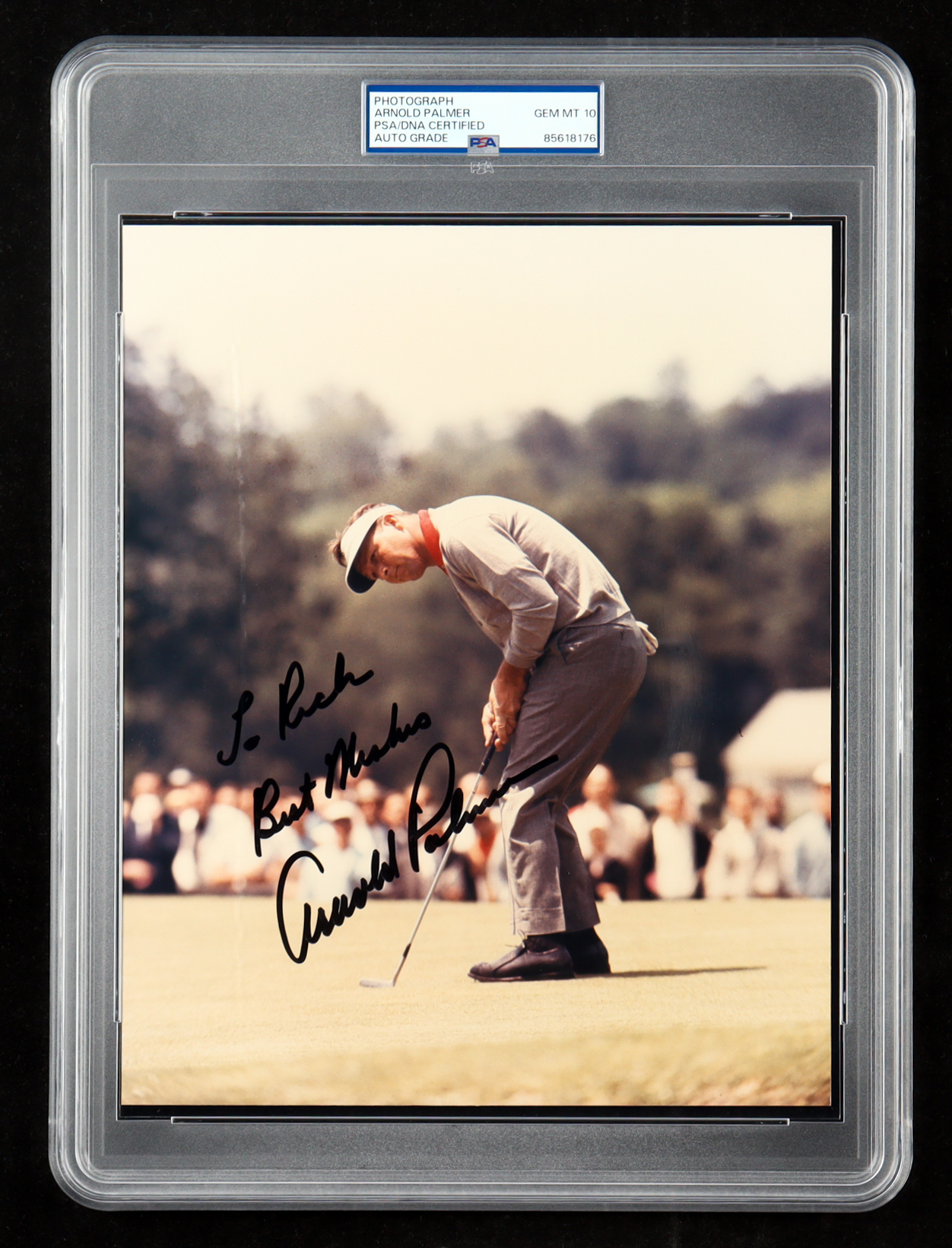 Photo measures 8" x 10" in size and has been hand-signed and inscribed by Arnold Palmer (D. 2016, HOF). Please note, the inscription is made out to "Rich".