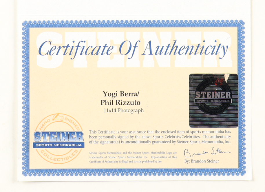 Custom frame measures approximately 17" x 21" in size and features a photo that has been hand-signed by Yogi Berra (D. 2015, New York Yankees, HOF) and Phil Rizzuto (D. 2007, New York Yankees, HOF). Please note, there is minor scuffing throughout the frame.