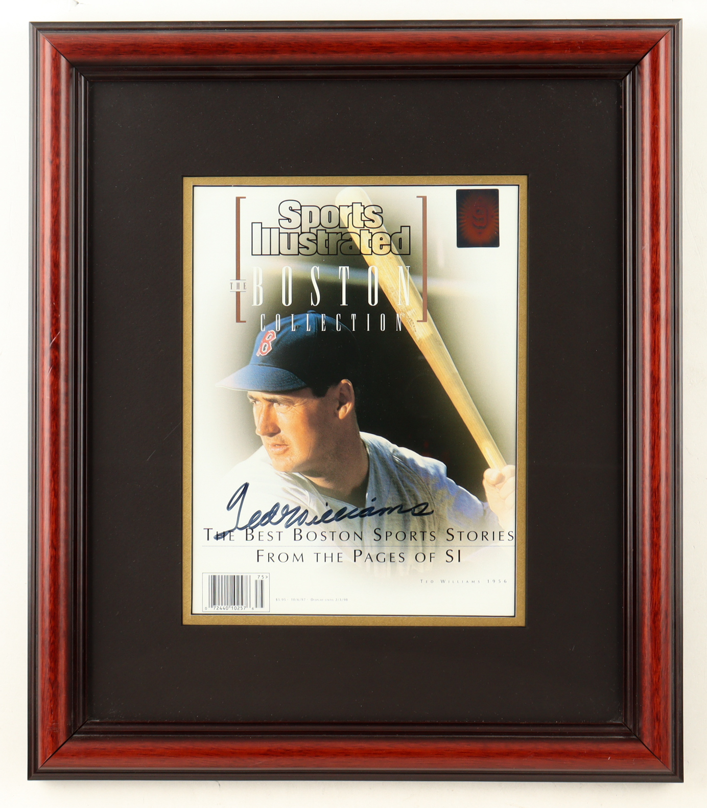 Custom frame measures approximately 15.25" x 17.75" in size and features a "Sports Illustrated" Magazine Cover dated October 6th, 1997 that has been hand-signed by Ted Williams (D. 2002, Boston Red Sox, HOF). Please note, there is minor scuffing throughout the frame.