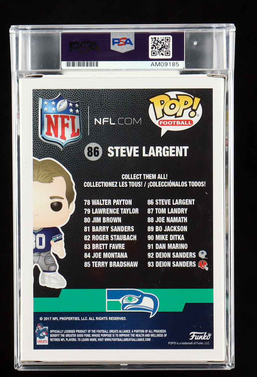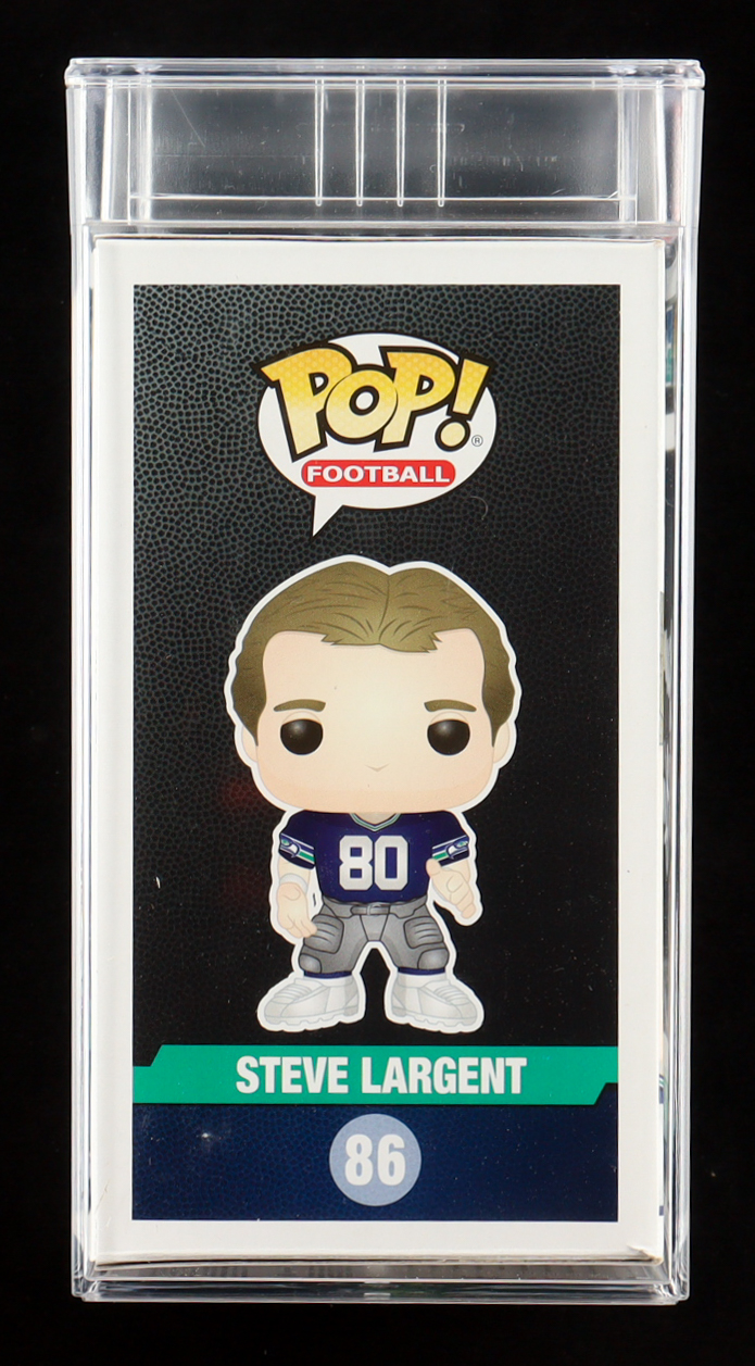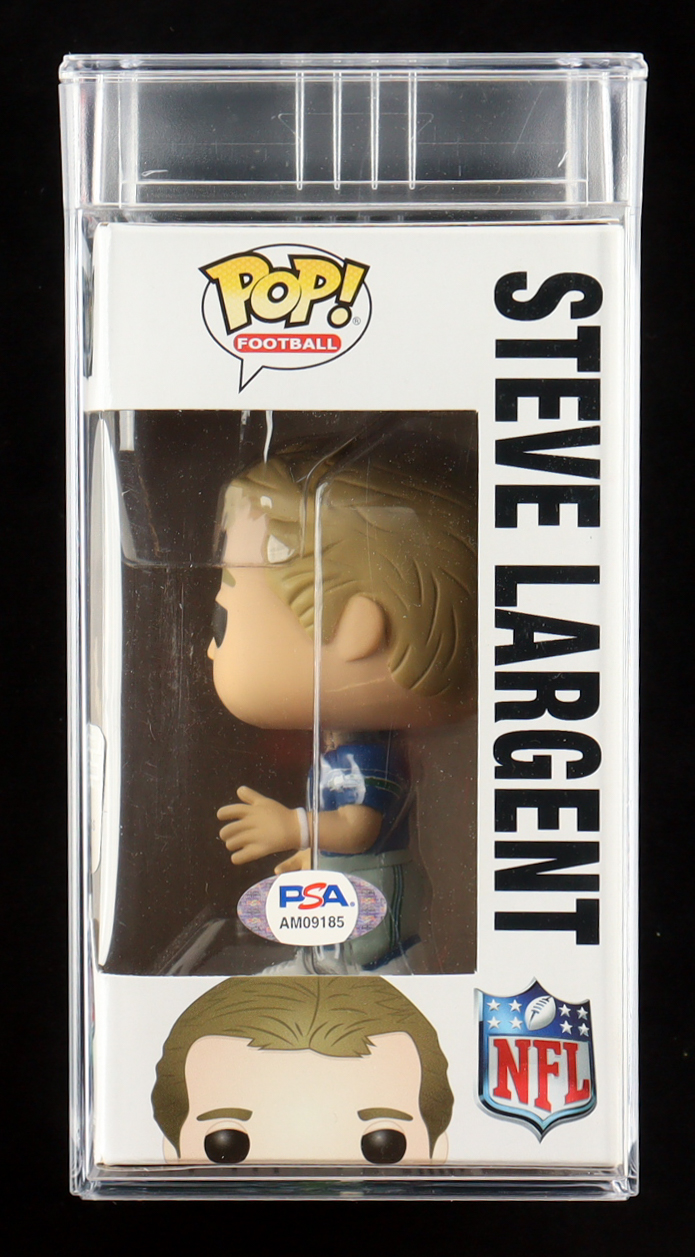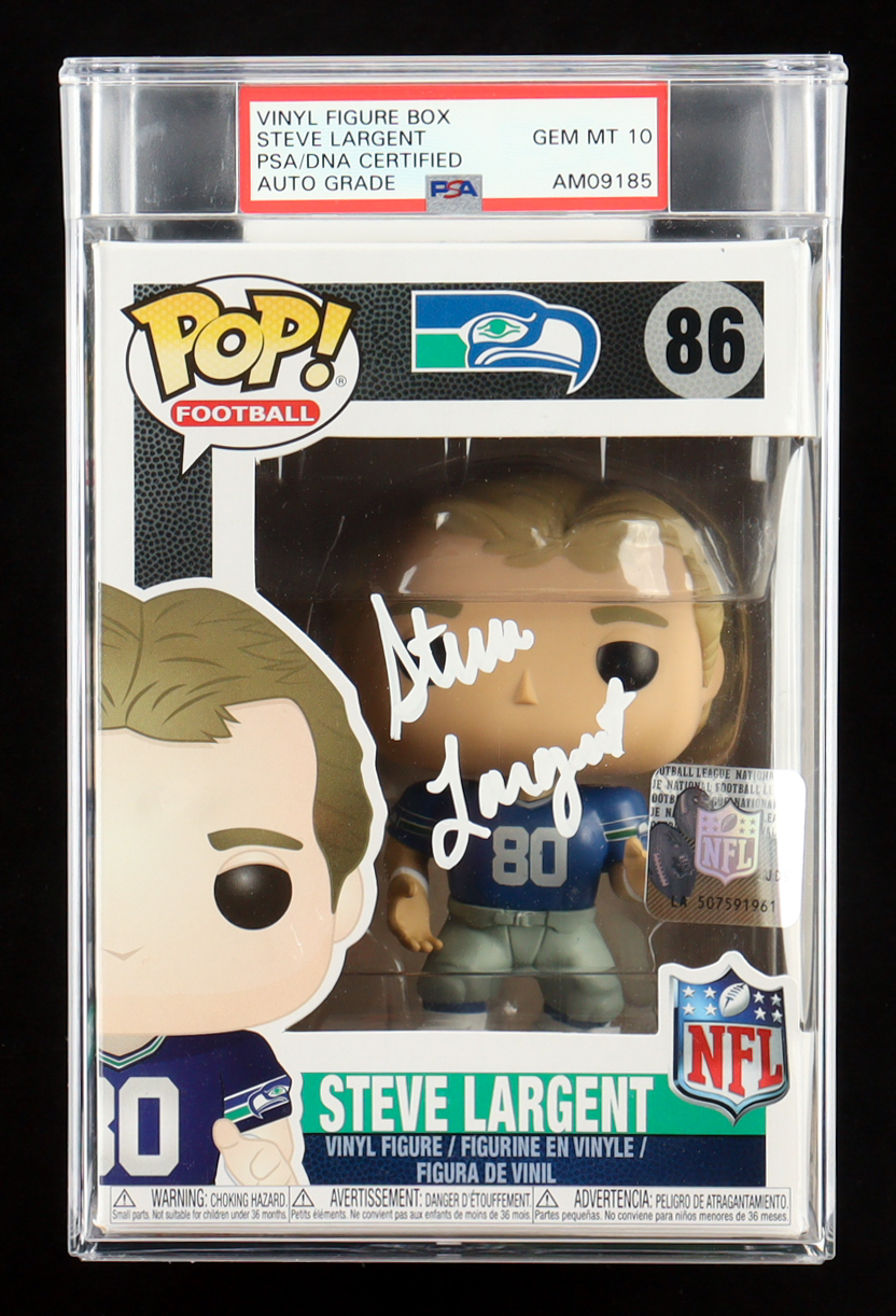 Funko Pop! vinyl figure measures approximately 4" tall. Hand-signed on the packaging by Steve Largent (Seattle Seahawks, HOF). Autograph has been graded (PSA Gem Mint 10).