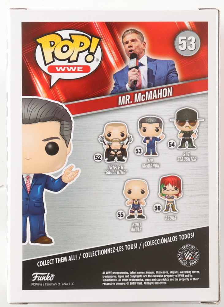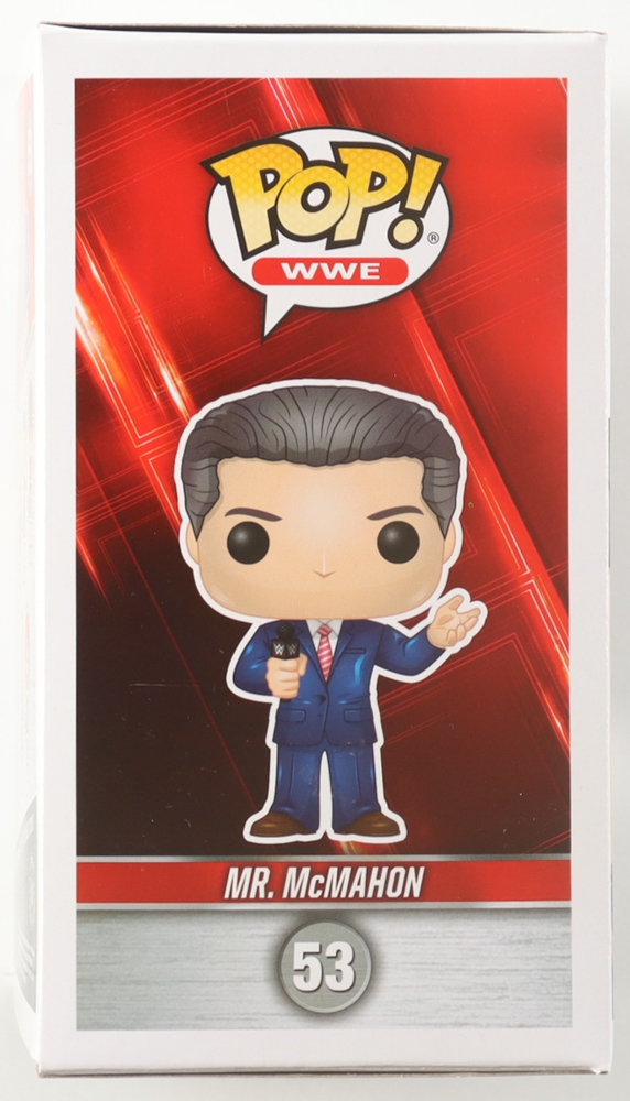 Funko Pop! vinyl figure measures approximately 4" in height and has been hand-signed on the packaging by Vince McMahon (HOF).