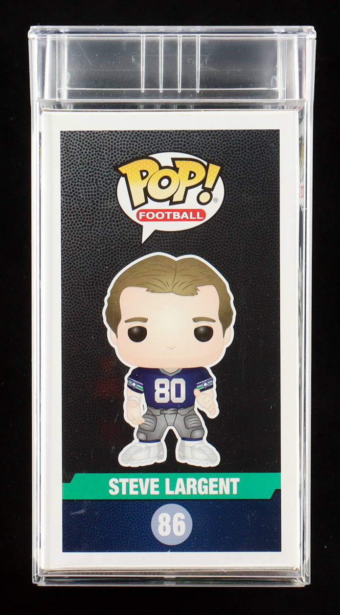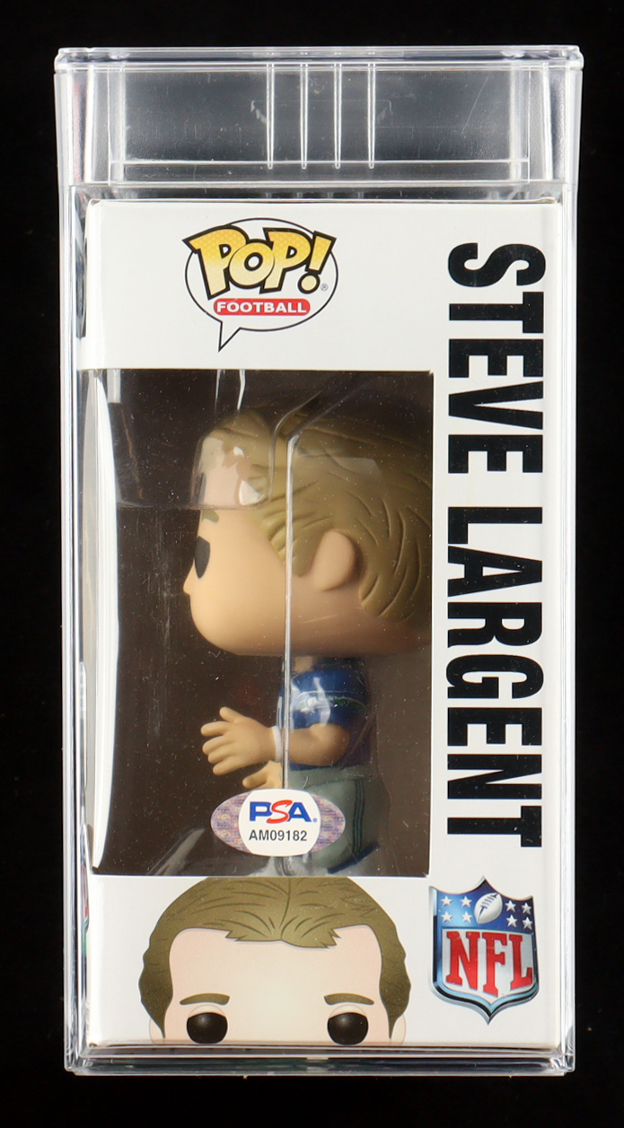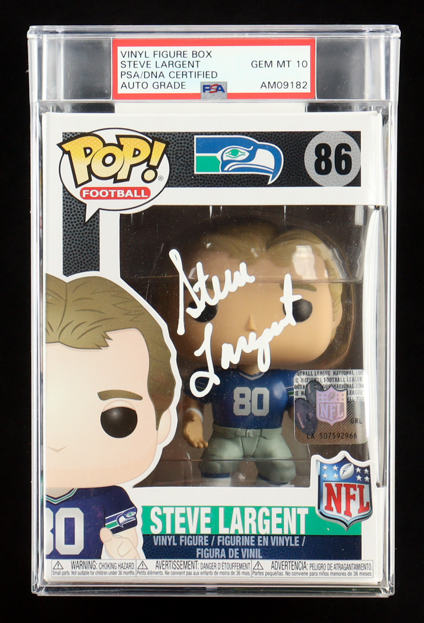 Funko Pop! vinyl figure measures approximately 4" tall. Hand-signed on the packaging by Steve Largent (Seattle Seahawks, HOF). Autograph has been graded (PSA Gem Mint 10).