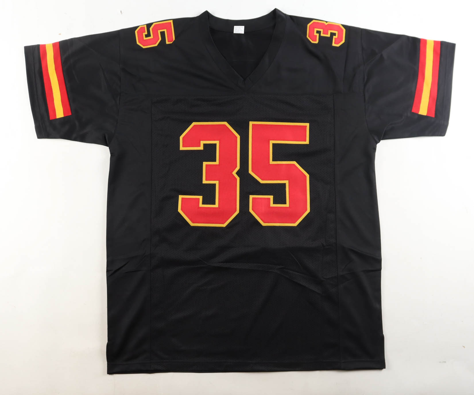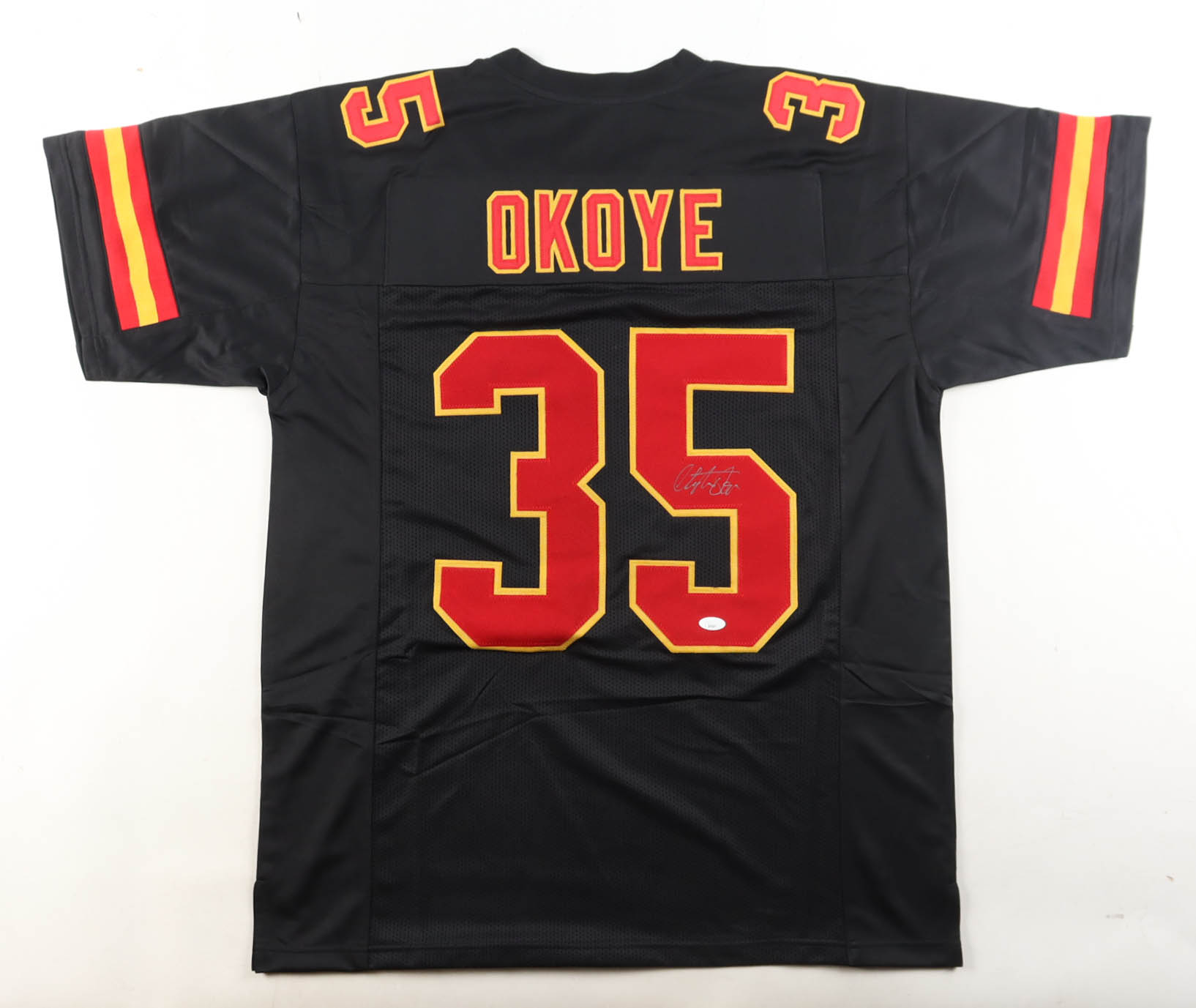 Custom jersey with everything sewn on, size XL. Hand-signed by Christian Okoye.