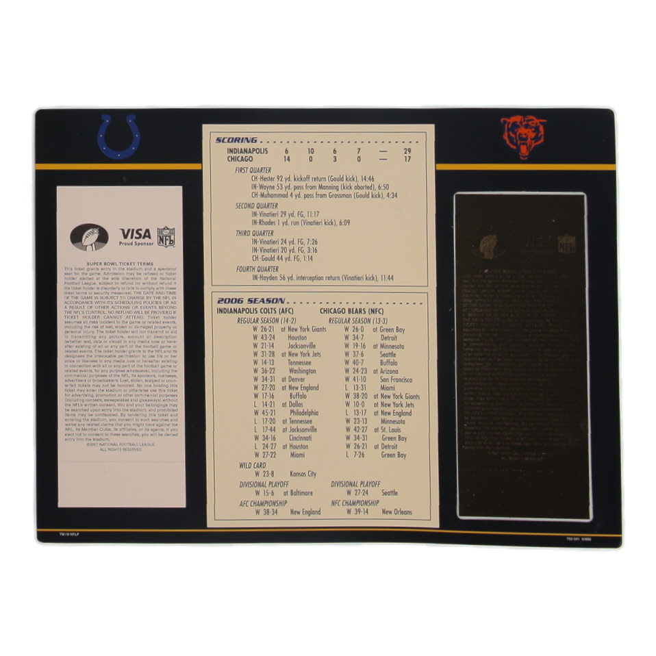 Commemorative Score Card that measures approximately 9" x 12" in size and come with a Super Bowl XLI 23KT Gold Ticket. Please note, the item is unsigned.