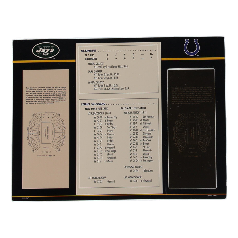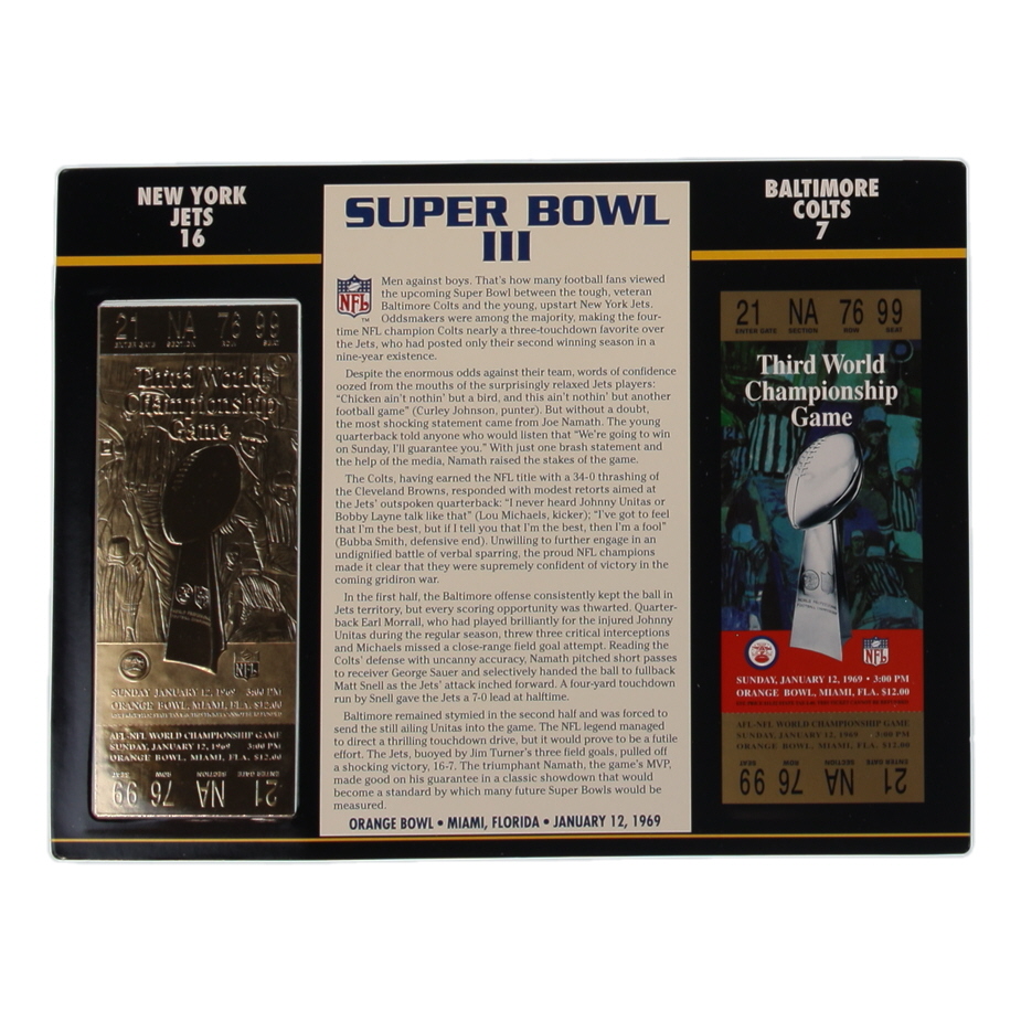 Super Bowl III Commemorative Score Card with 23KT Gold Ticket Framed Display