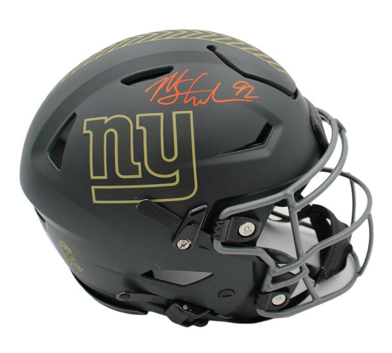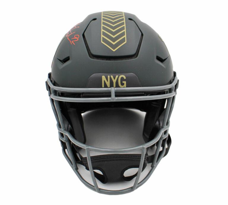 Riddell New York Giants full-size authentic on-field salute to service alternate speedflex helmet has been hand-signed by Michael Strahan (HOF).