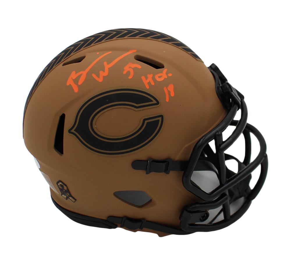 Riddell Chicago Bears salute to service alternate speed mini helmet has been hand-signed and inscribed by Brian Urlacher (HOF).