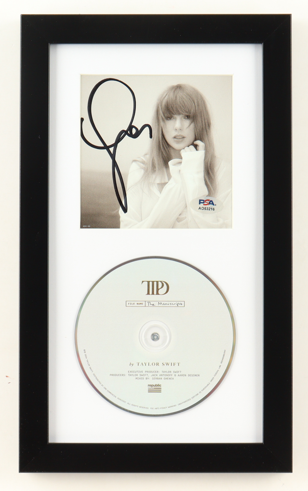 Custom frame measures 8" x 13" in size. "The Tortured Poets Department" CD album slipcover has been hand-signed by Taylor Swift. Display also includes the CD.