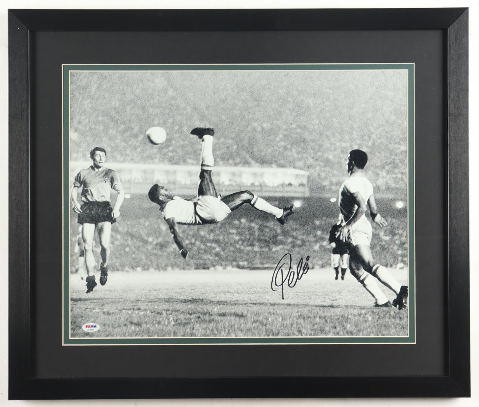 Custom frame measures 22” x 26” in size and features a photo that has been hand-signed by Pele (D. 2022, HOF).