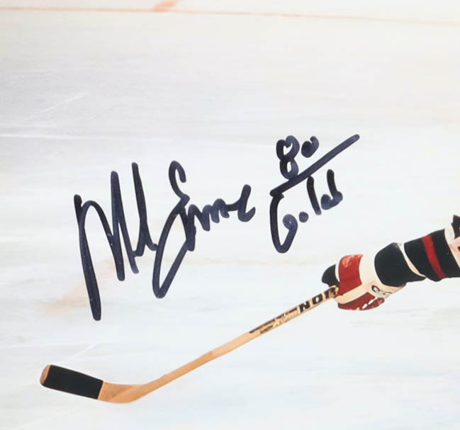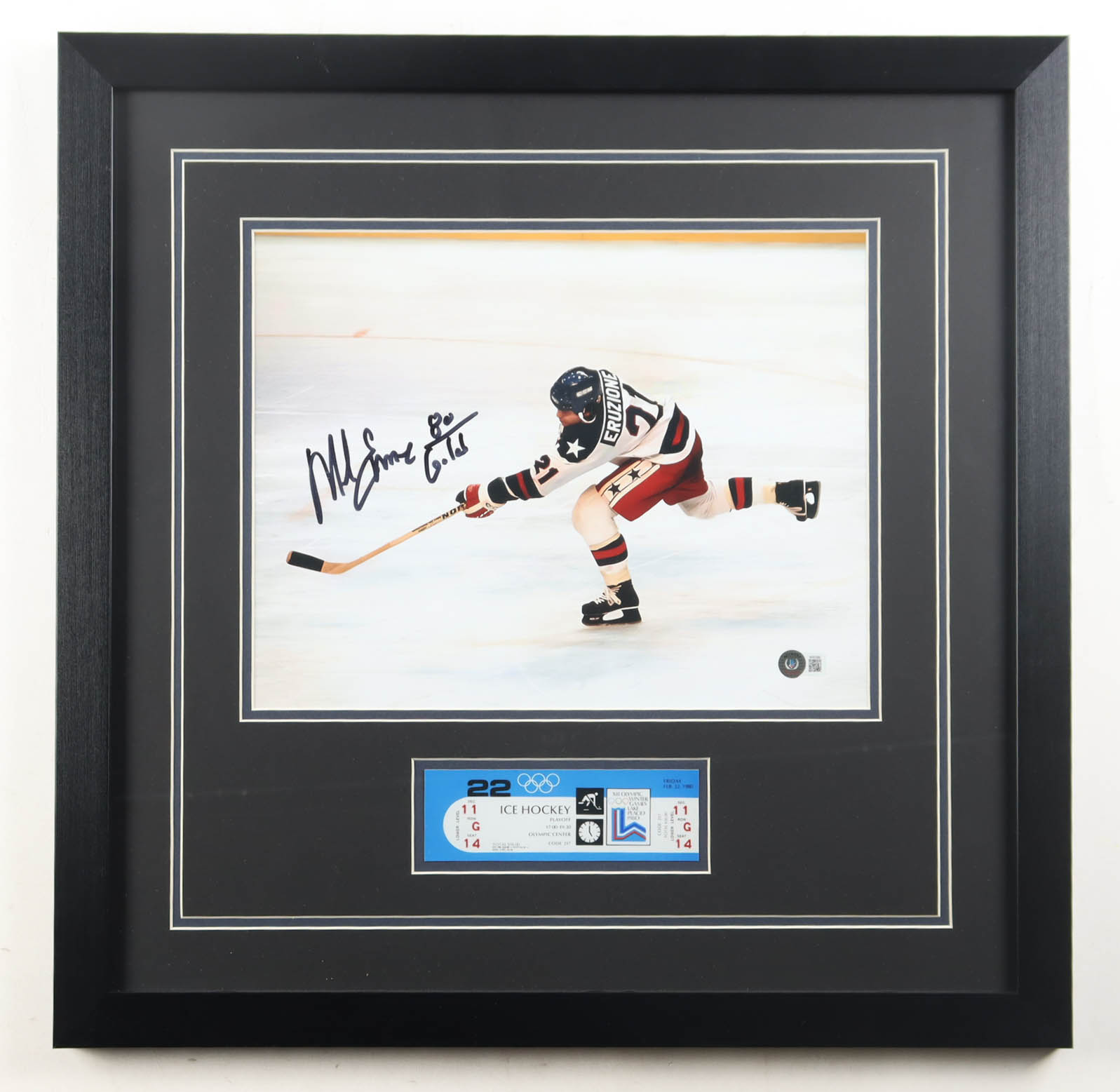 Custom frame measures approximately 22" x 22" in size, and features a photo that has been hand-signed and inscribed by Mike Eruzione (Team USA).