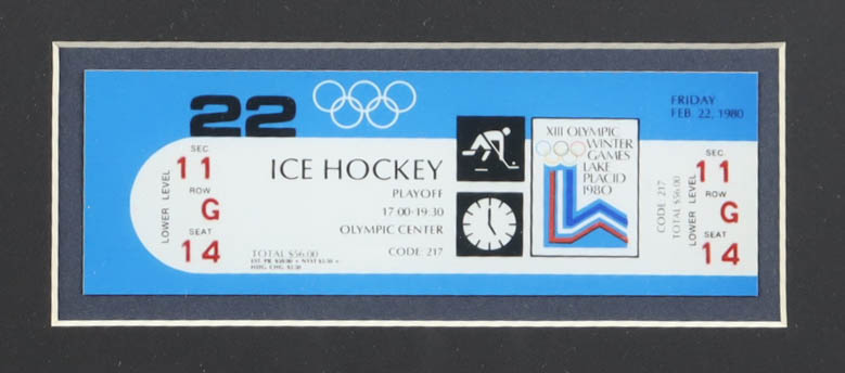 Mike Eruzione Signed Custom Framed Photo Display Inscribed "80 Gold" with Replica 2022 Olympics Ticket (Beckett)