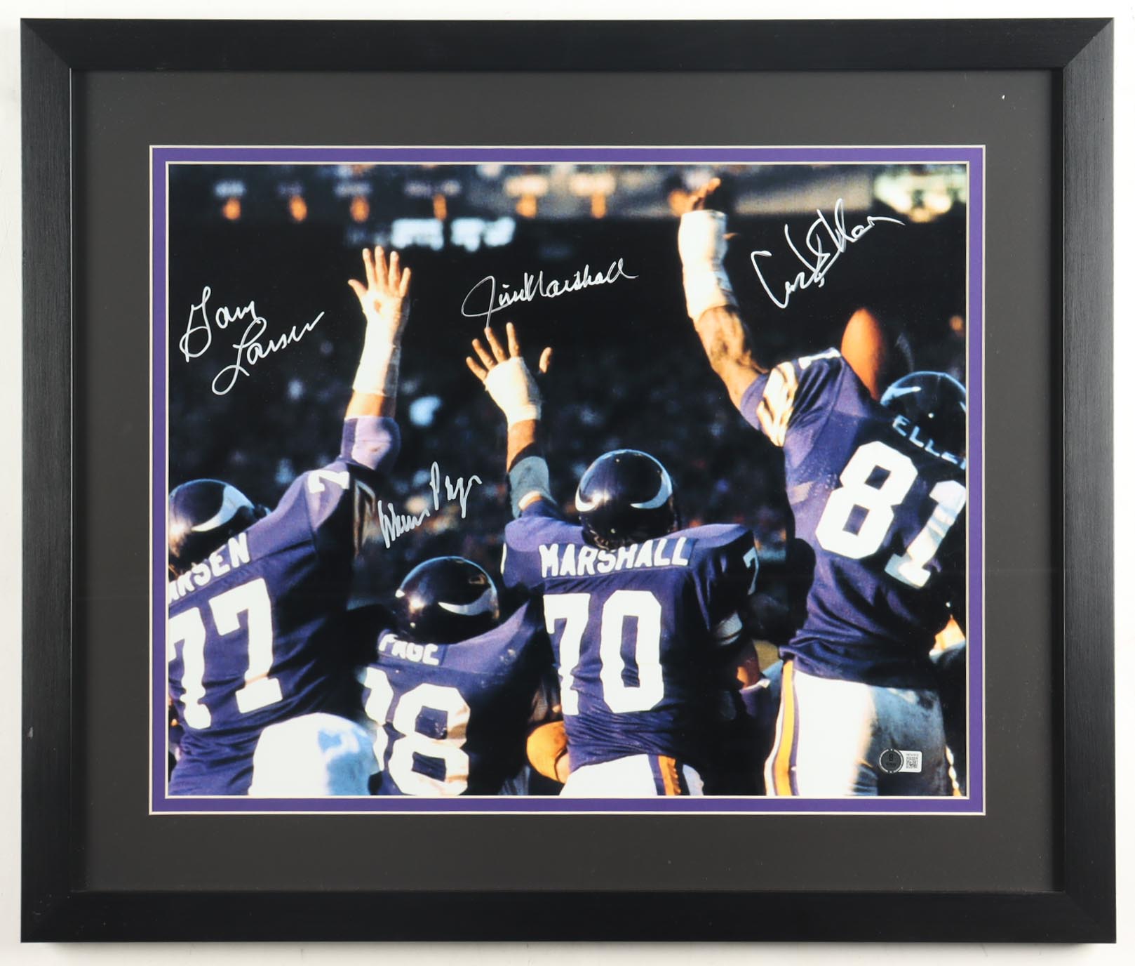 Custom framed display measures approximately 22" x 26" in size and features a photo that has been hand-signed (4) by former members of the Minnesota Vikings including Carl Eller, Jim Marshall, Gary Larsen and Alan Page.
