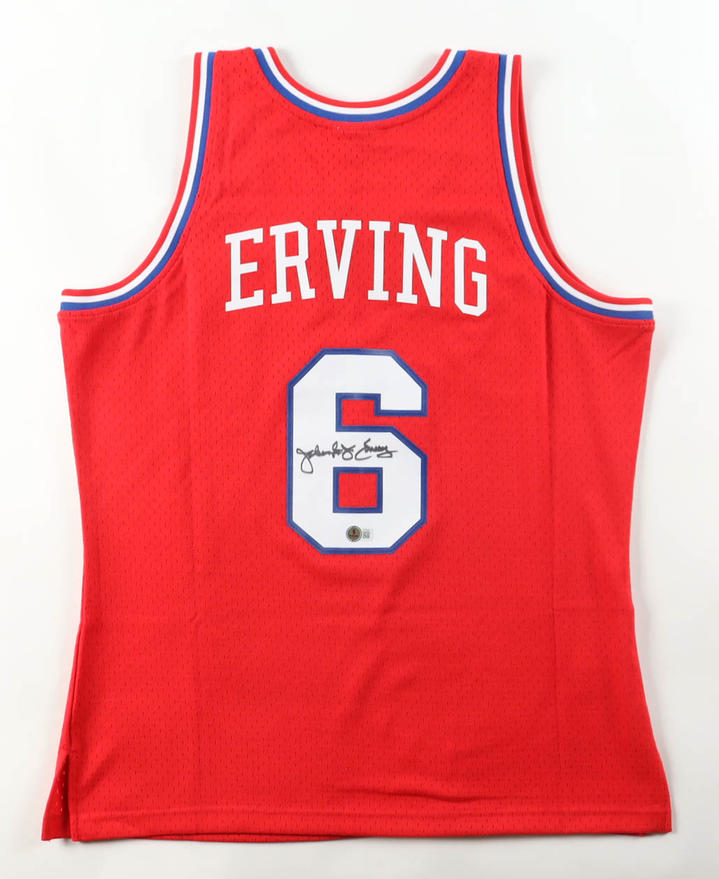 Mitchell & Ness jersey with everything pressed on, size L. Hand-signed by Julius "Dr. J" Erving (Philadelphia 76ers, HOF).
