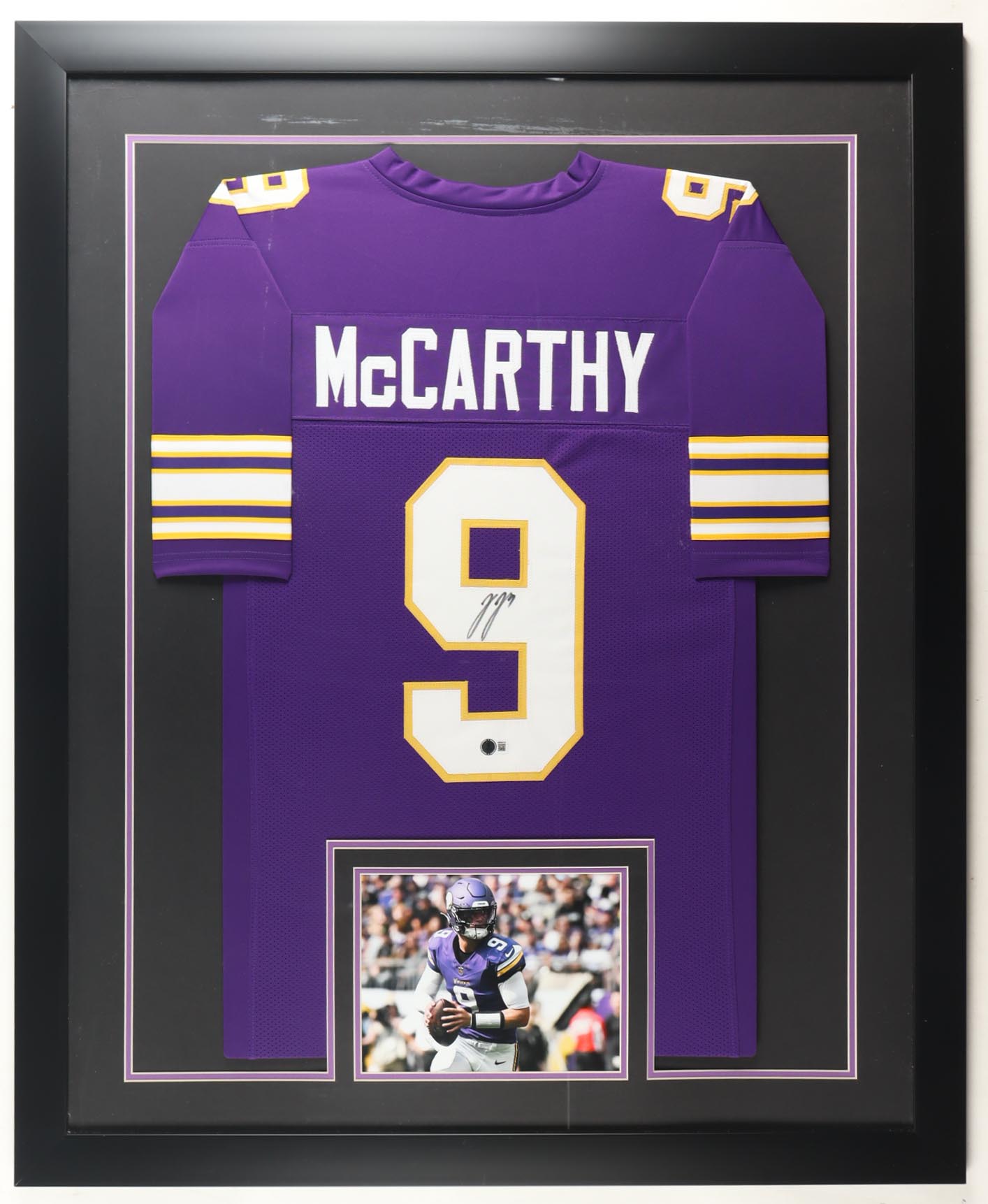 Custom frame measures 35.5" x 43.5" in size and features a jersey that has been hand-signed by JJ McCarthy.