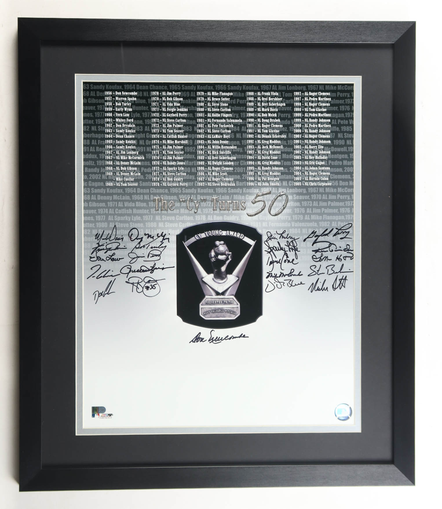 Cy Young 50th Anniversary Custom Framed Photo Display Signed by (21) with Tom Glavine, Doc Gooden, David Cone, Run Guidry (AIV)