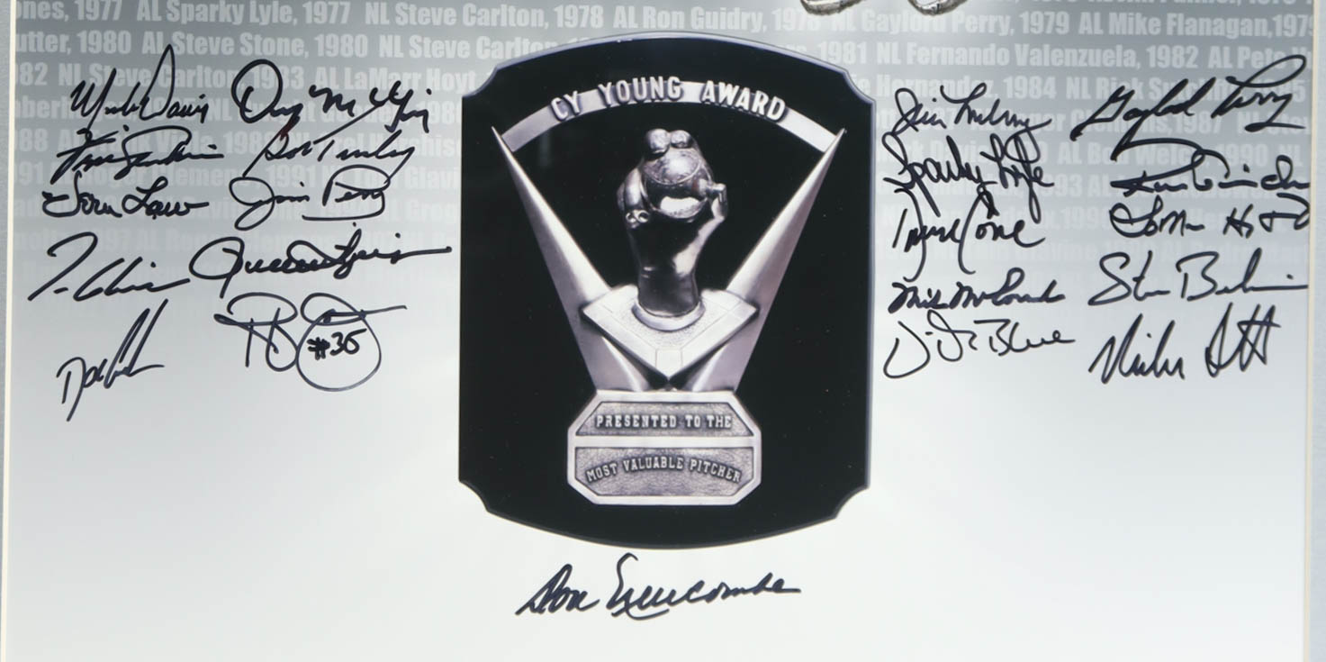 Custom frame measures approximately 22" x 26" in size and has been hand-signed by (21) Cy Young award winners, including Tom Glavine, Doc Gooden, David Cone, Ron Guidry, Gaylord Perry, Fergie Jenkins, Bob Turley, Don Newcombe, Rollie Fingers, Vida Blue, Mike Scott, Jim Lonborg, Denny McClain, Vern Law, Jim Perry, Randy Jones, Sparky Lyle, Mike McCormick, LaMarr Hoyt, Mark Davis, and Steve Bedrosian