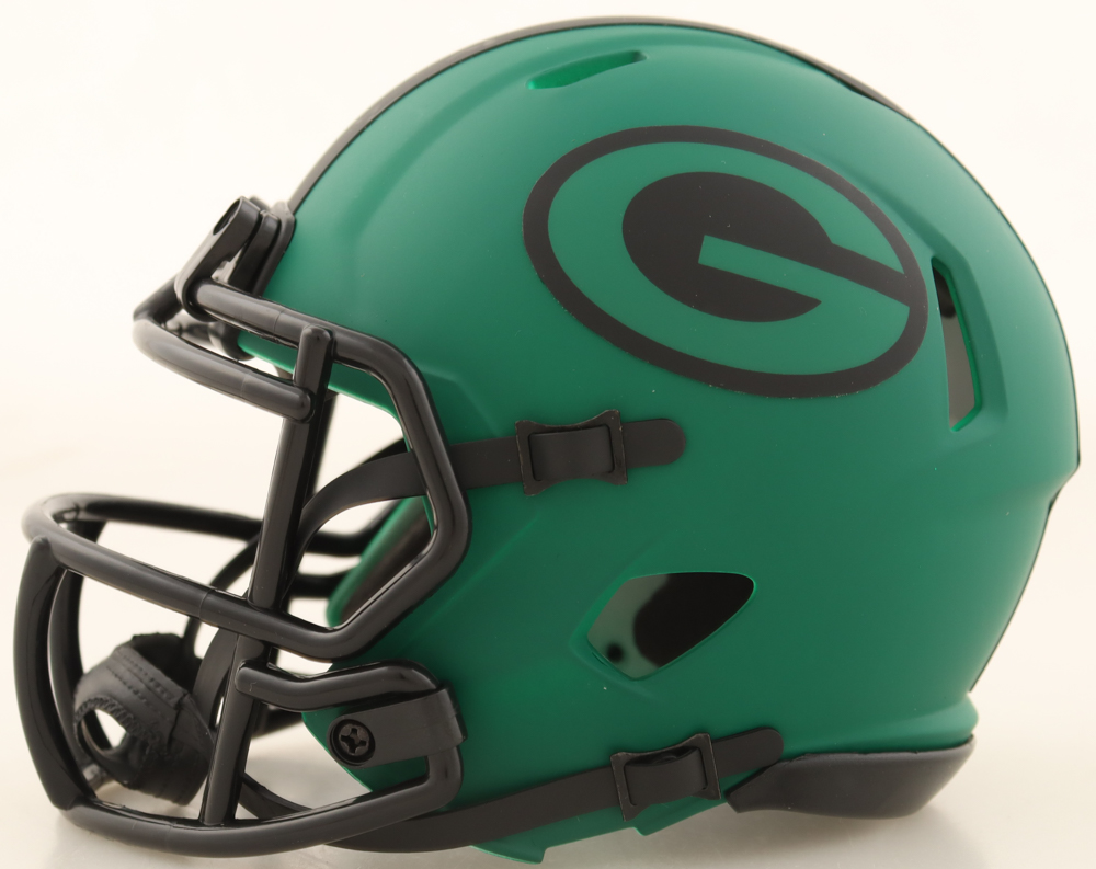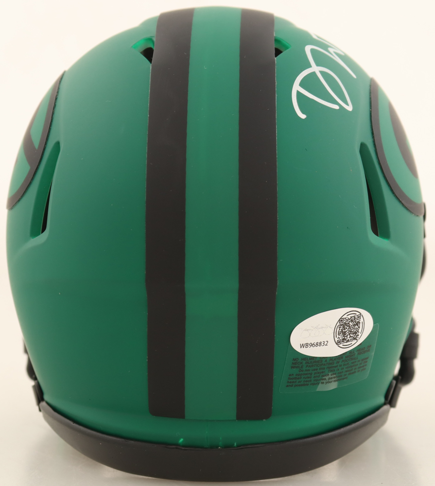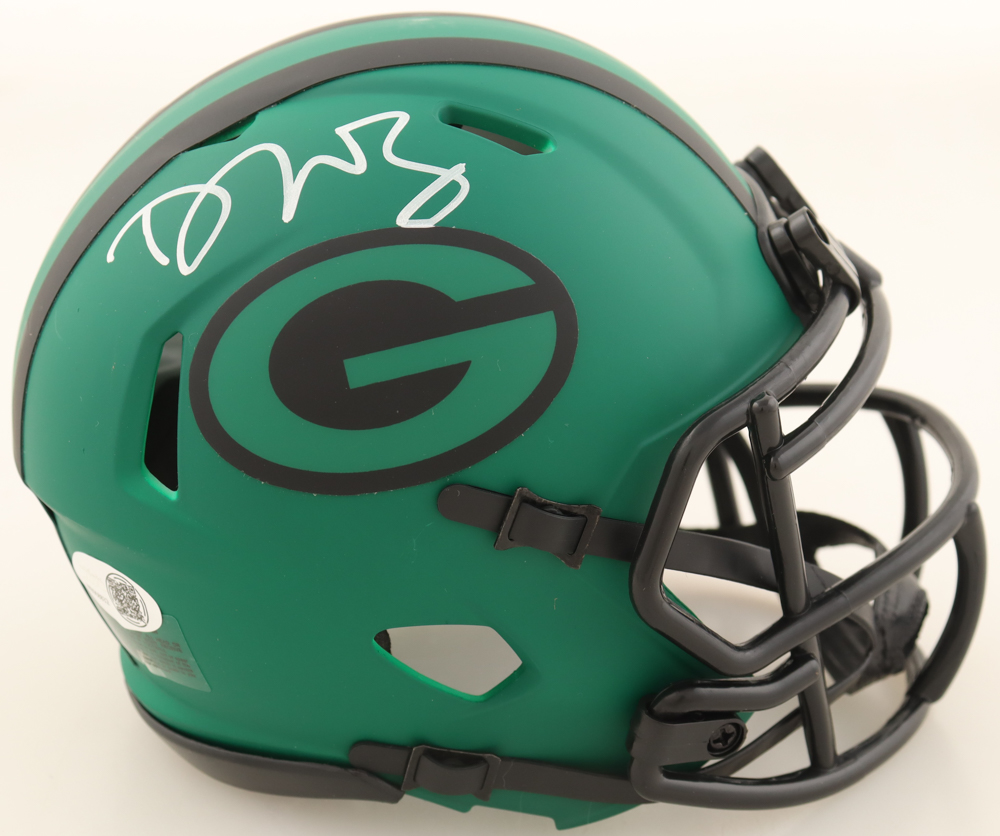 Riddell Green Bay Packers Rave Alternate speed mini helmet. Hand-signed and inscribed by Dontayvion Wicks.