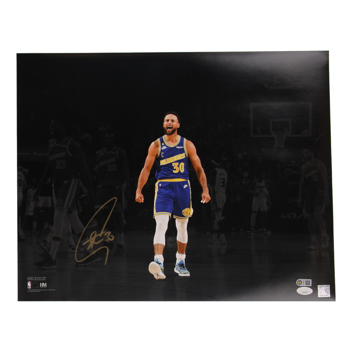 Photo measures 16" x 20" in size and has been hand-signed by Steph Curry (Golden State Warriors).