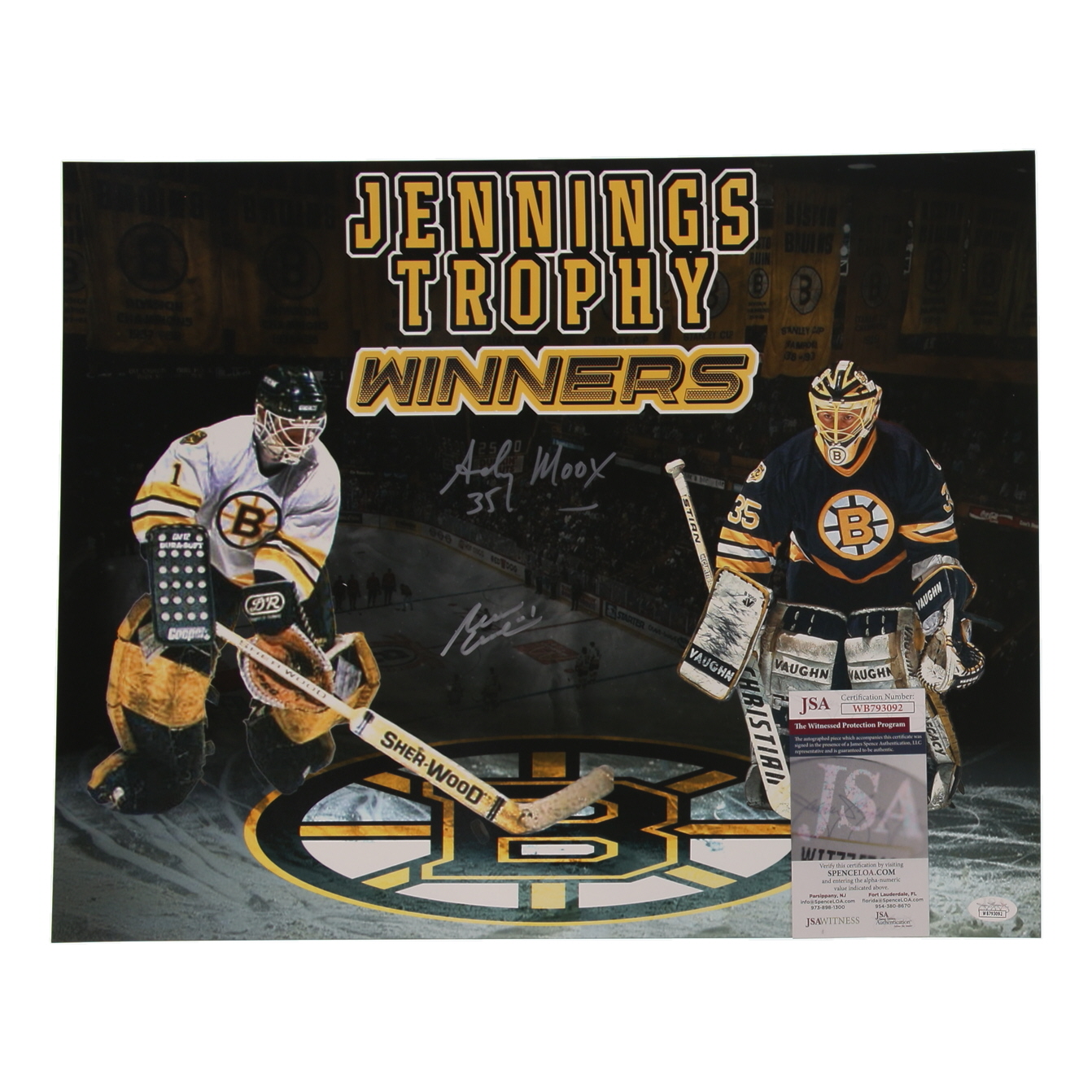 Photo measures 16" x 20" in size. Hand-signed by Rejean Lemelin and Andy Moog (Boston Bruins).