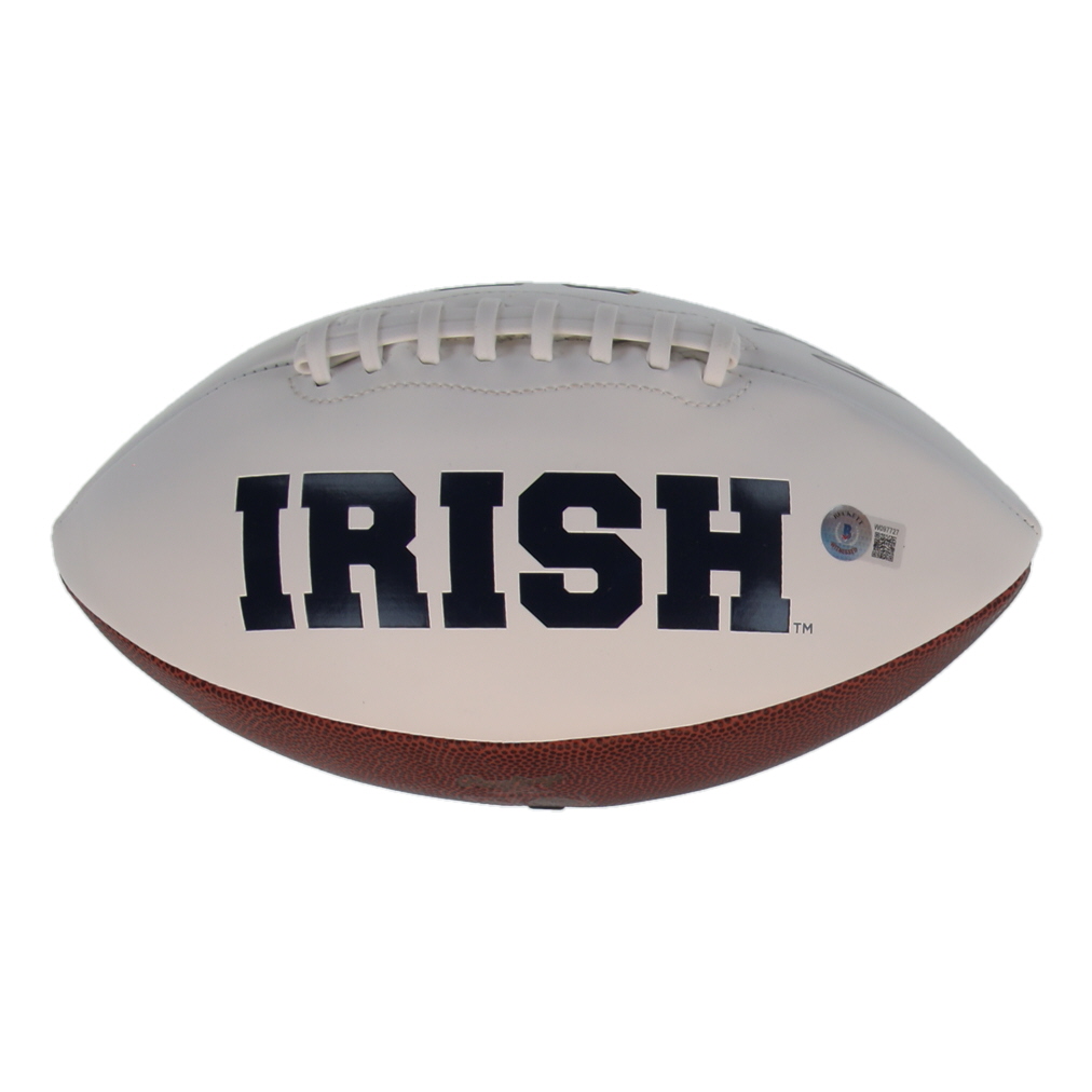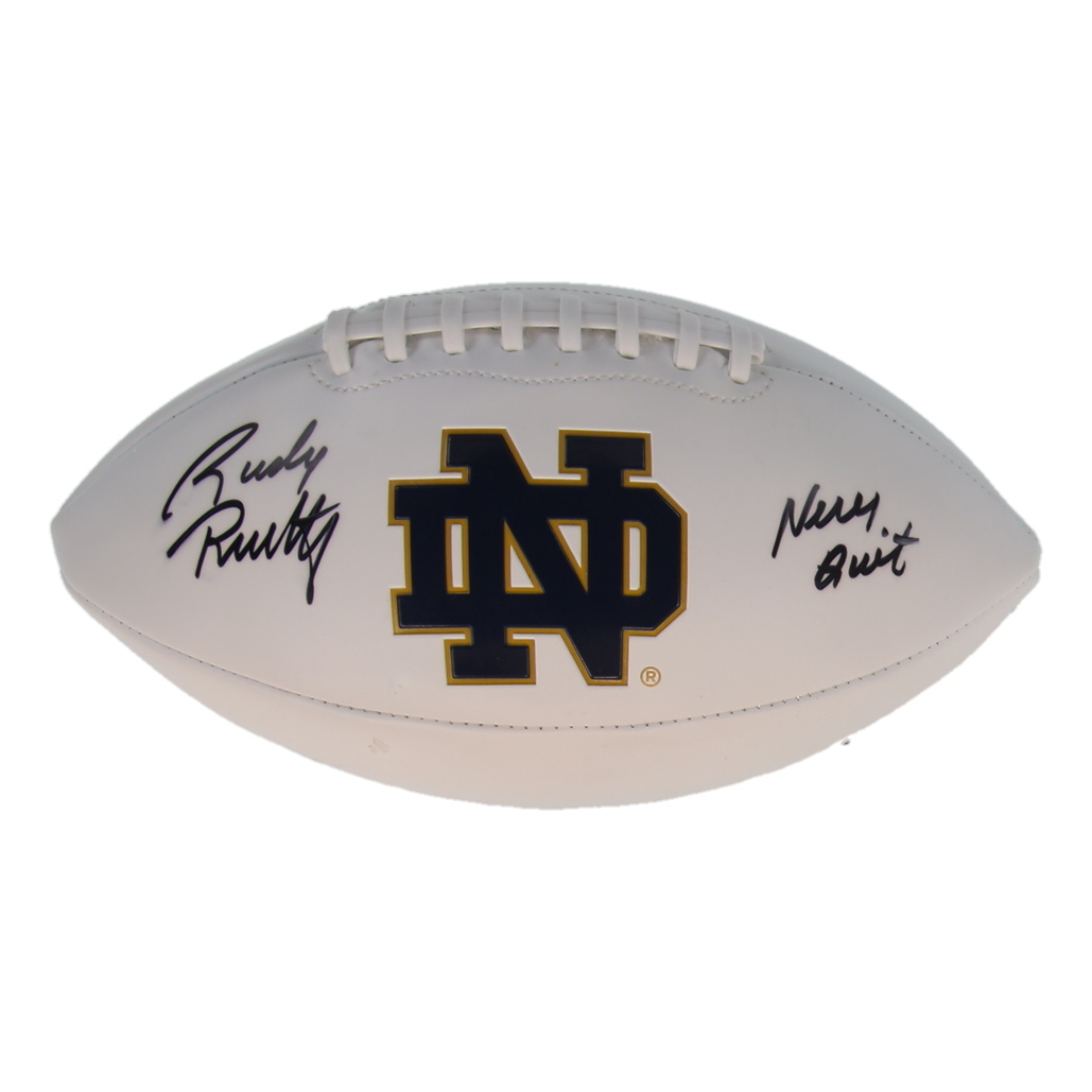 Rawlings Notre Dame Fighting Irish Logo Football. Hand-signed and inscribed by Rudy Ruettiger. Please note, there are stains and scuffing on the football.