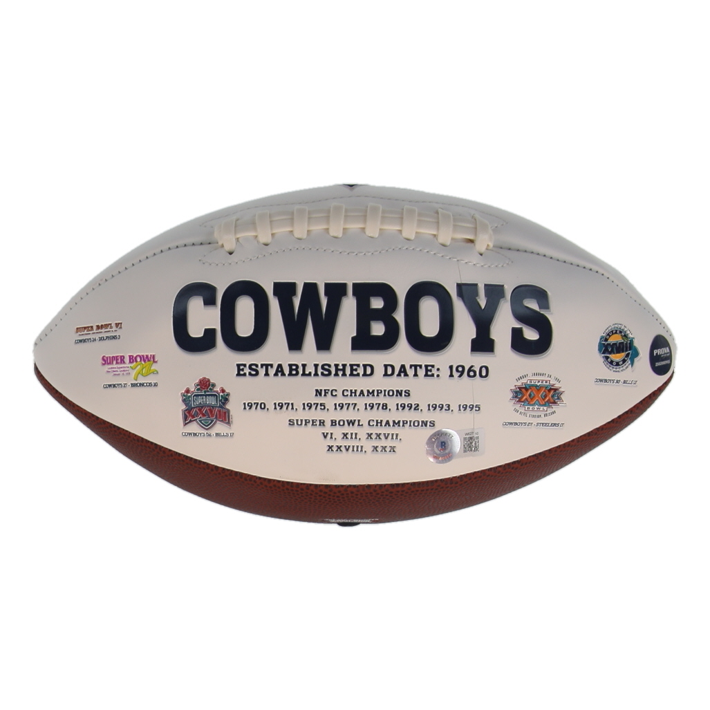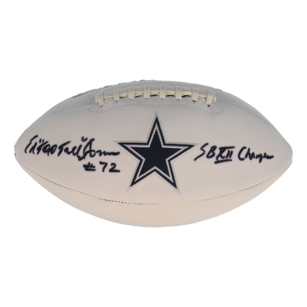 Dallas Cowboys logo football. Hand-signed by Ed "Too Tall" Jones. Please note, there is a vertical cut on the authentication sticker panel intersecting with the hologram.