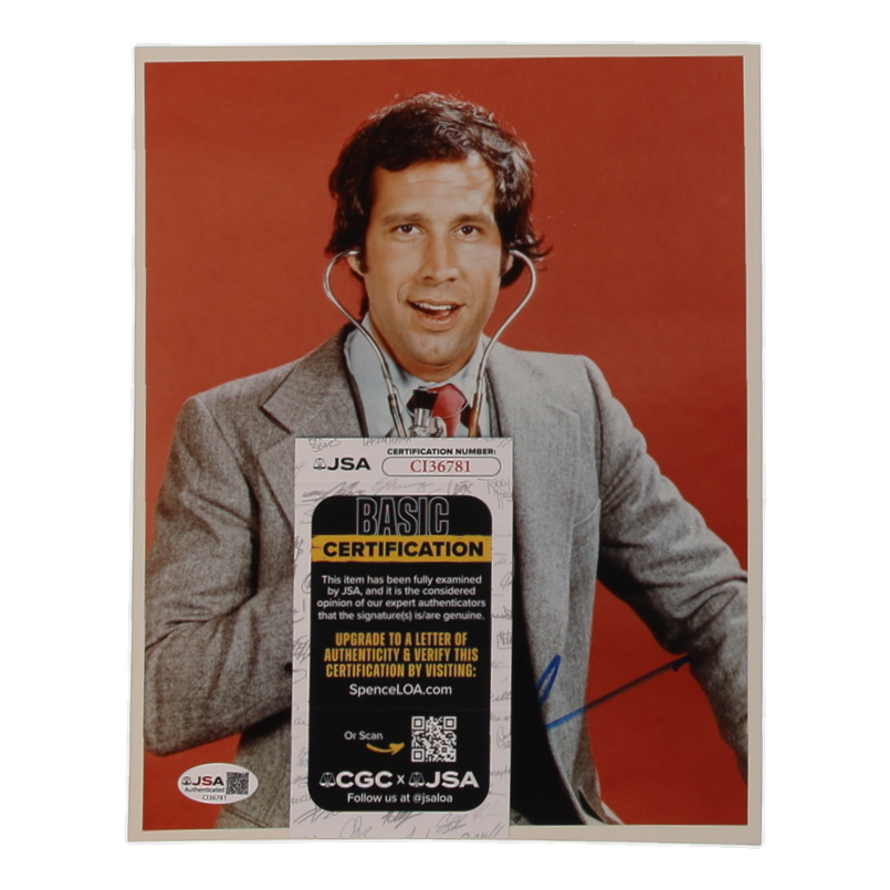 Photo measures 8” x 10” in size and has been hand-signed by Chevy Chase.