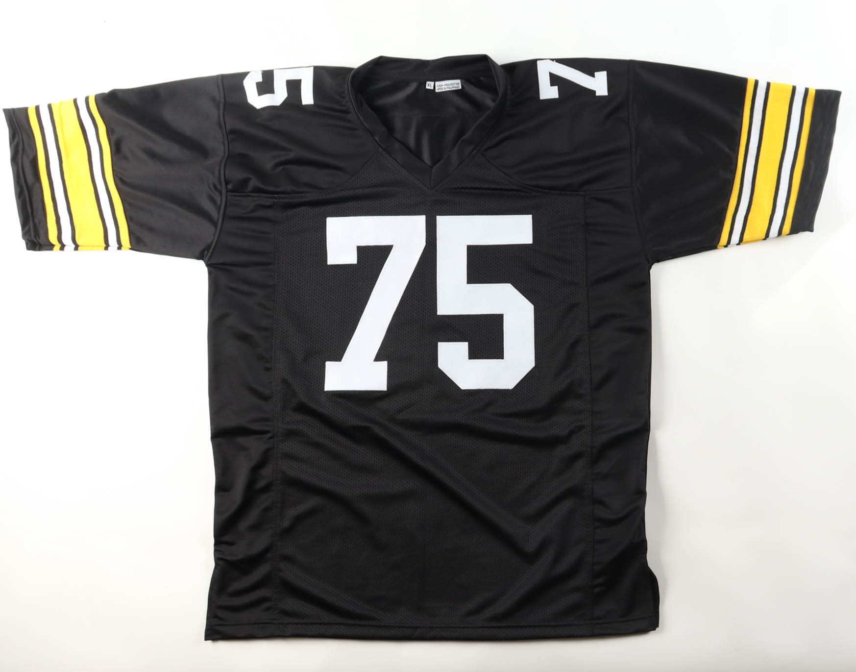 Custom jersey with everything sewn on, size XL. Hand-signed and inscribed by Joe Greene (HOF). Please note, glue is visible through the reverse number.
