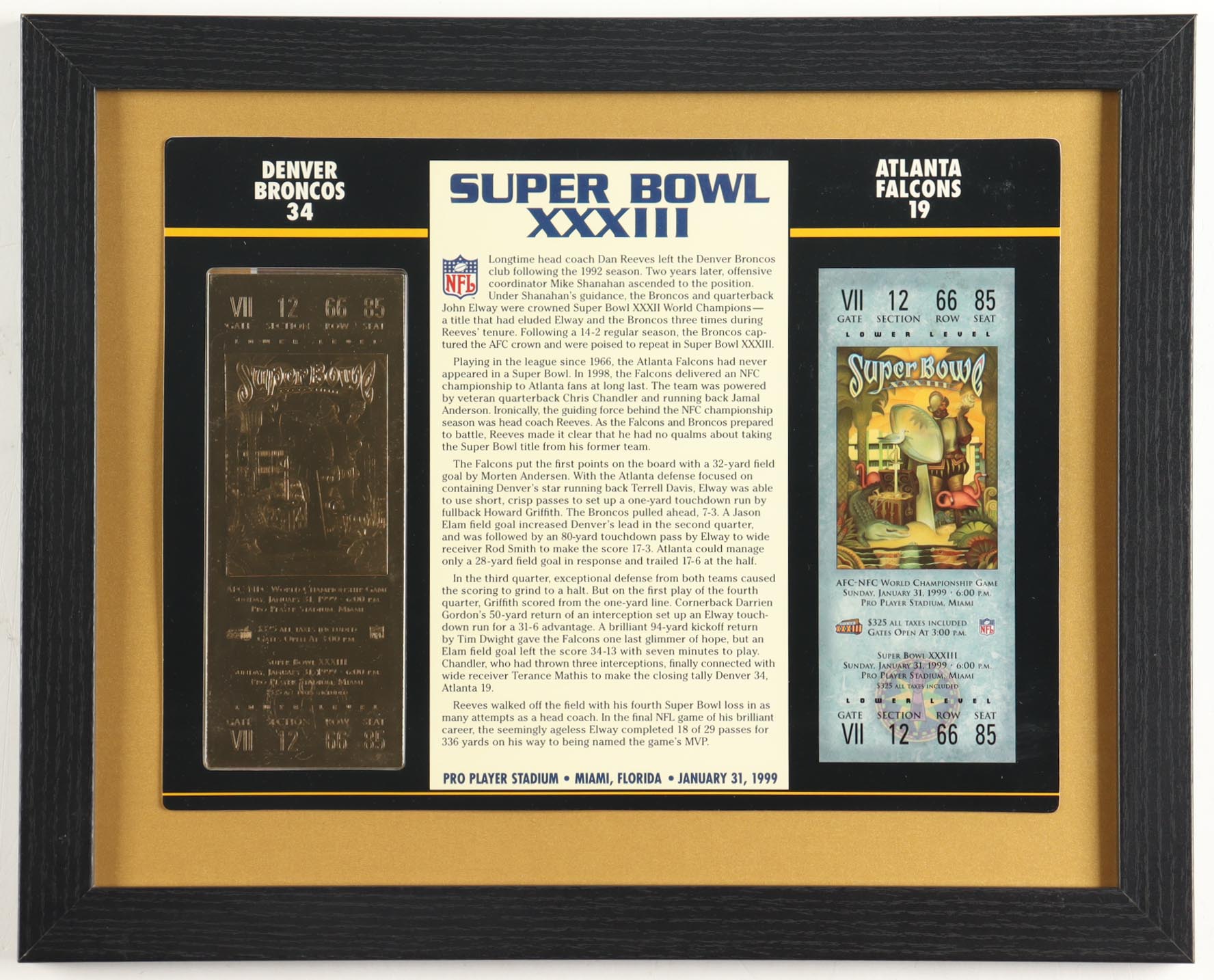 Super Bowl XXXIII Commemorative Score Card with 23KT Gold Ticket Framed Display