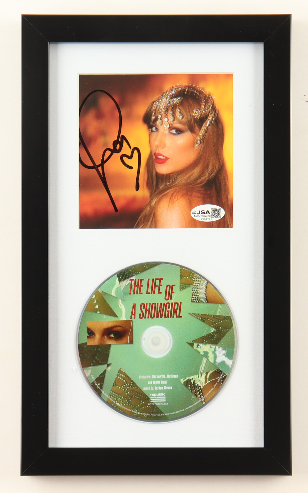 Custom frame measures approximately 8" x 13.5" in size and features a "The Life of a Showgirl" CD insert that has been hand-signed by Taylor Swift. Disc included as shown. Please note, there is some scuffing on the frame.