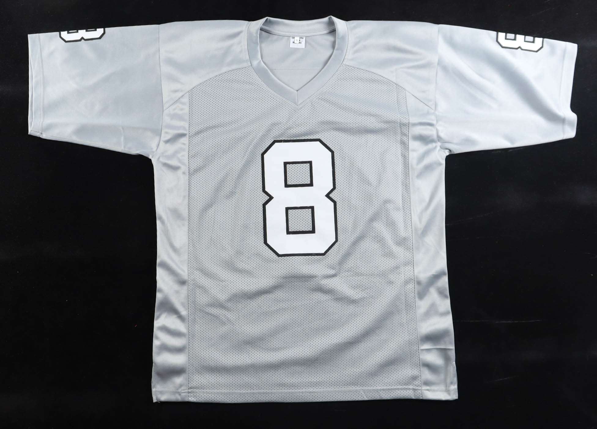 Custom jersey with everything sewn on, size XL. Hand-signed and inscribed by Ray Guy (D. 2022, HOF).