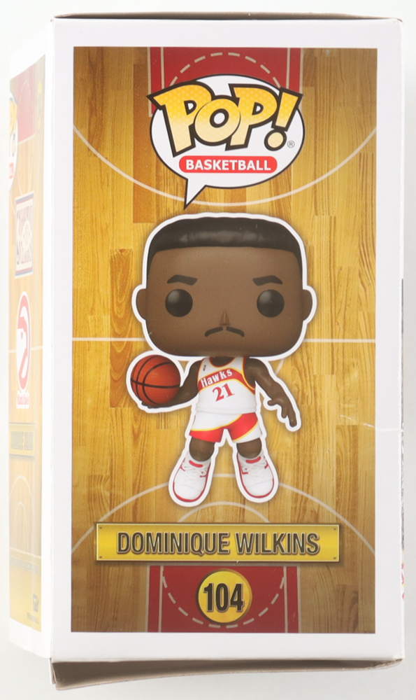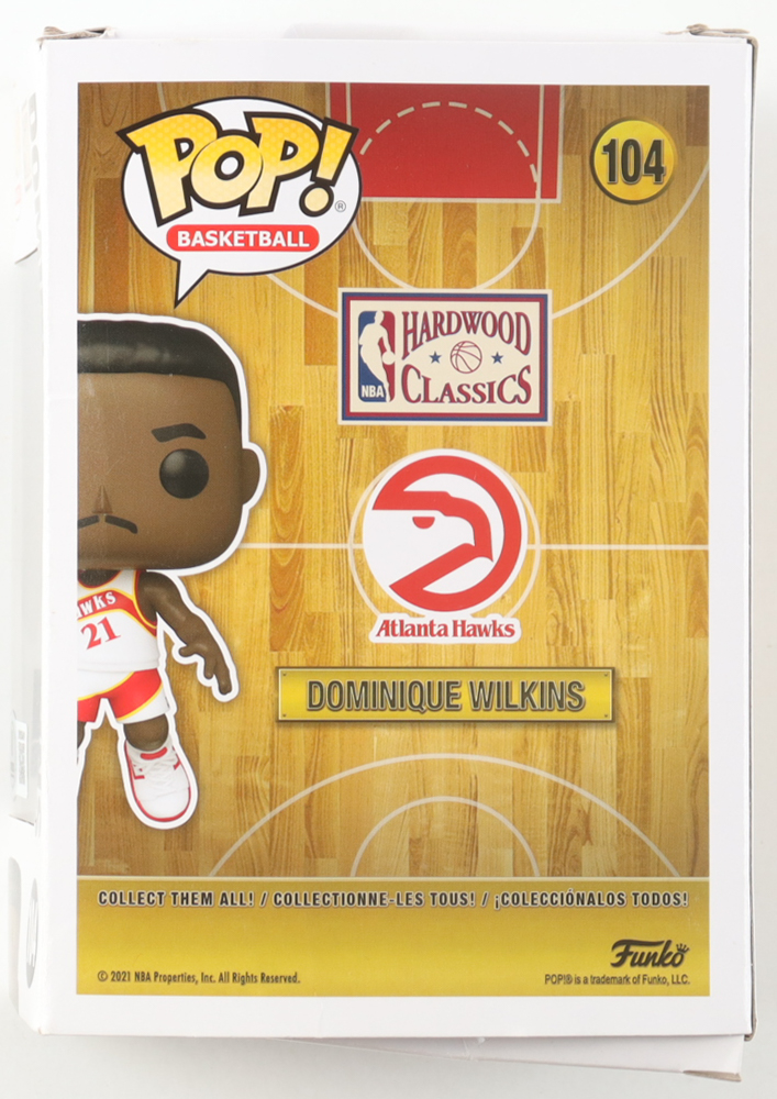 Funko Pop! vinyl figure measures approximately 4" in height and has been hand-signed on the packaging by Dominique Wilkins (Atlanta Hawks, HOF). Please note, the edges of the box are creased.