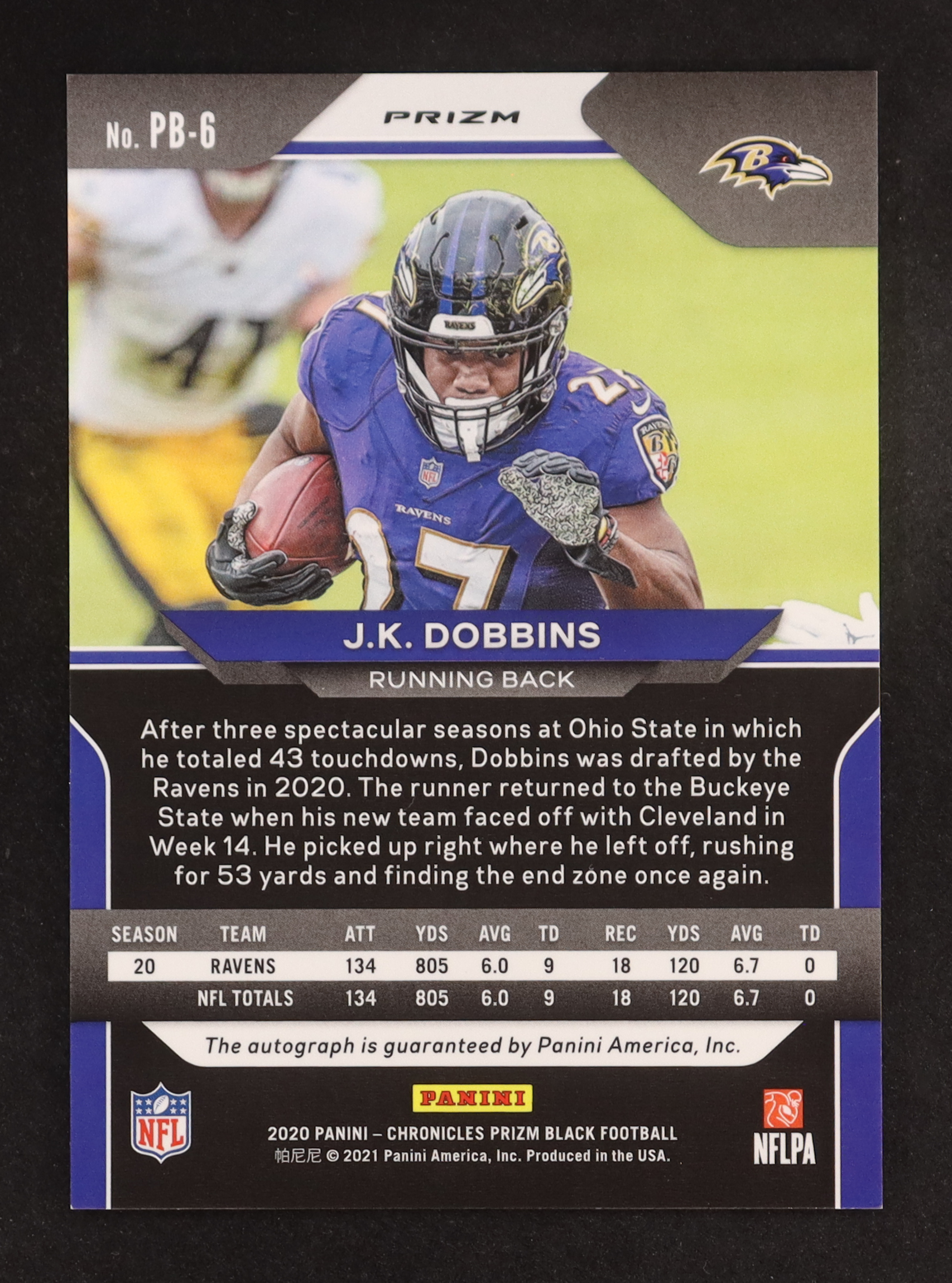 J.K. Dobbins 2020 Panini Prizm Black Signatures #6 RC