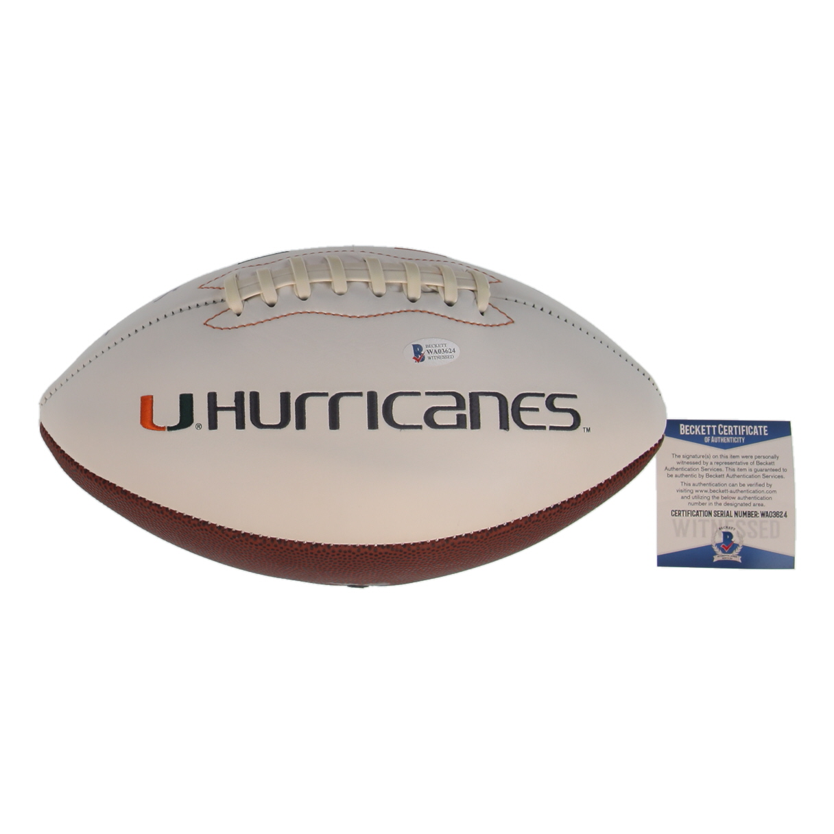 Franklin Miami Hurricanes logo football has been hand-signed and inscribed by Vinny Testaverde. Please note, the signature and inscription have bled.