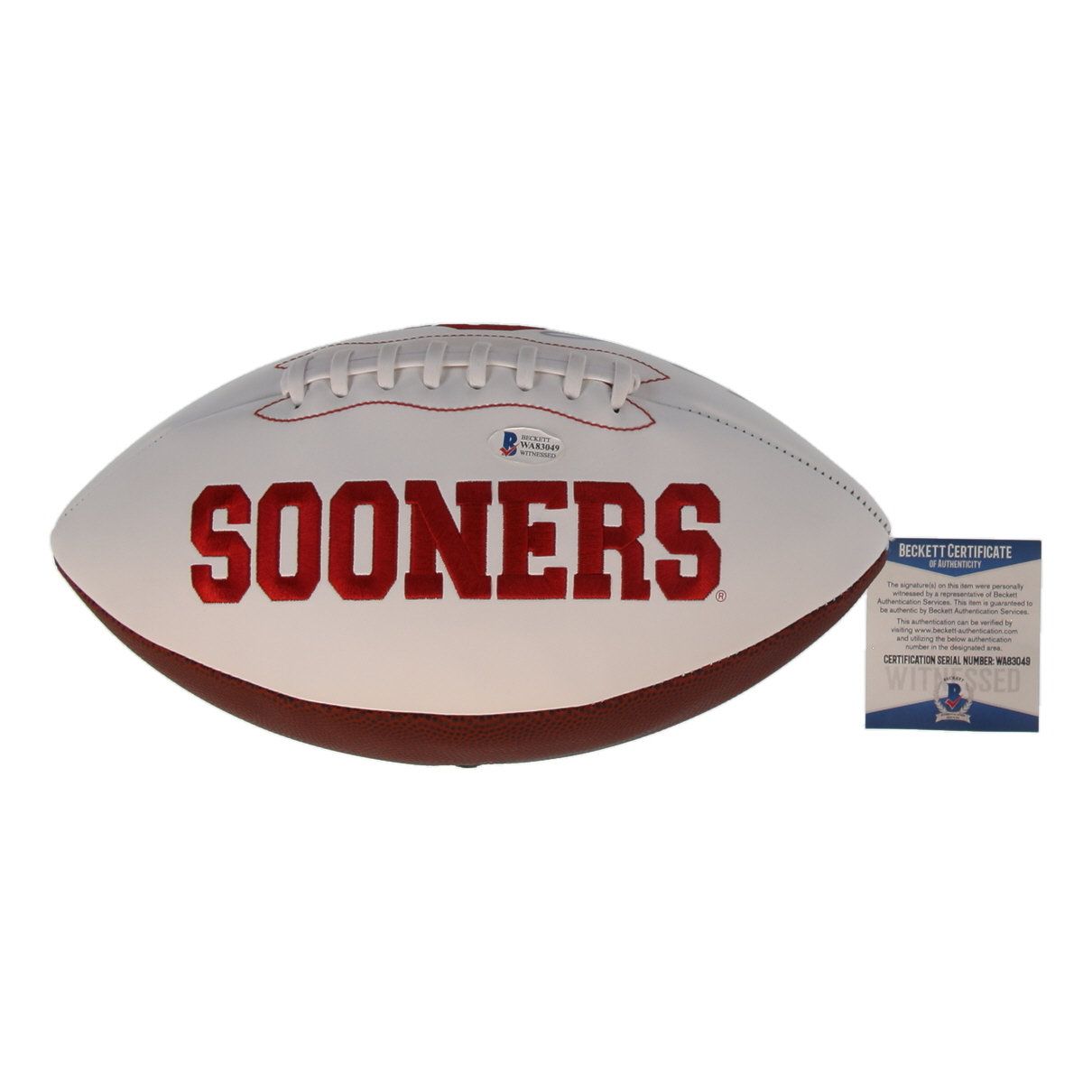Rawlings Oklahoma Sooners logo football has been hand-signed and inscribed by Sam Bradford. Please note, the signature and inscription have bled.