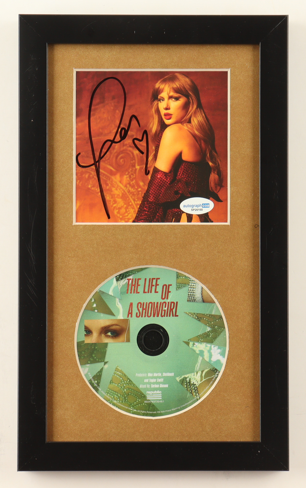 Custom frame measures approximately 8" x 13.5" in size and features a "The Life of a Showgirl" CD insert that has been hand-signed by Taylor Swift. Disc included.