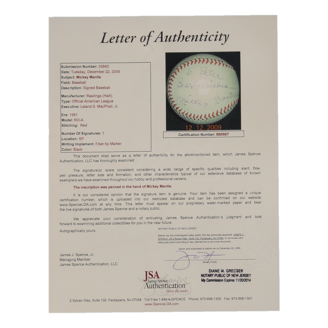 Mickey Mantle Signed OAL Baseball Inscribed "To Peter Best Wishes" (JSA)