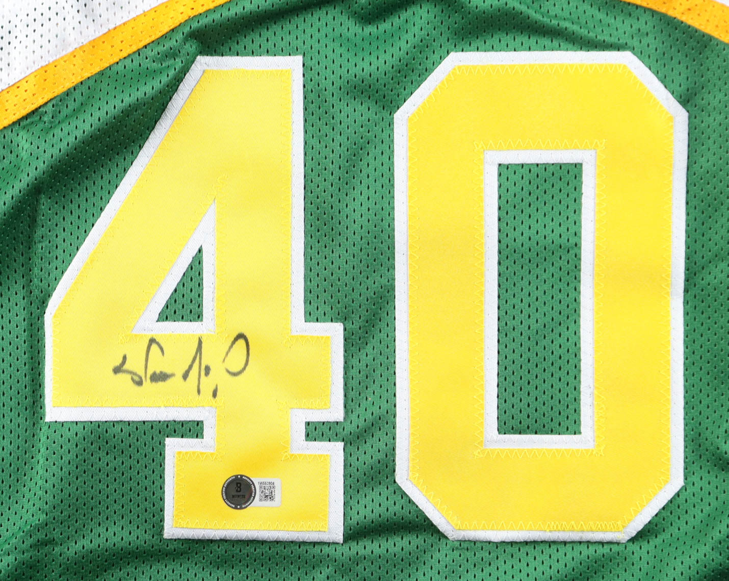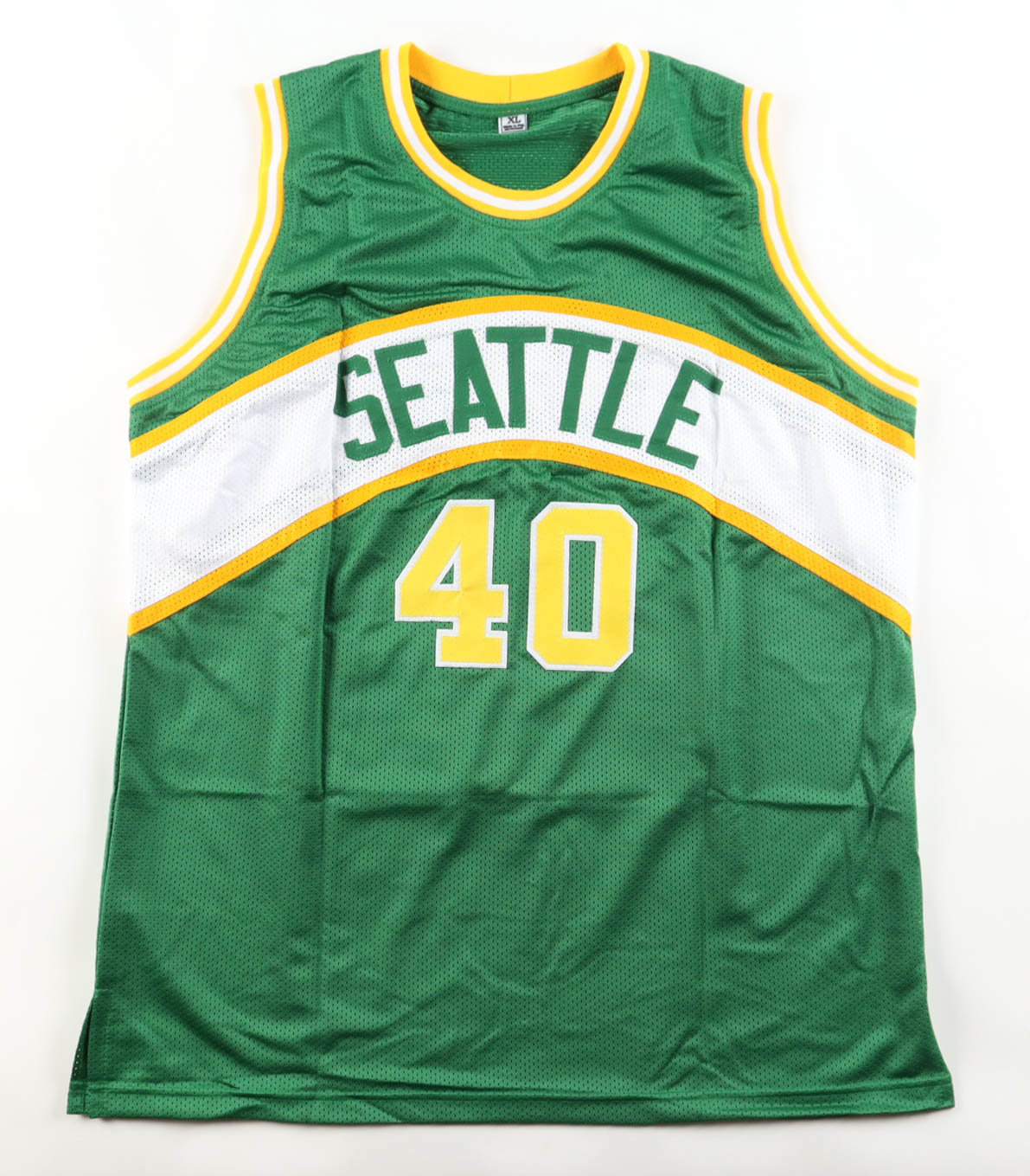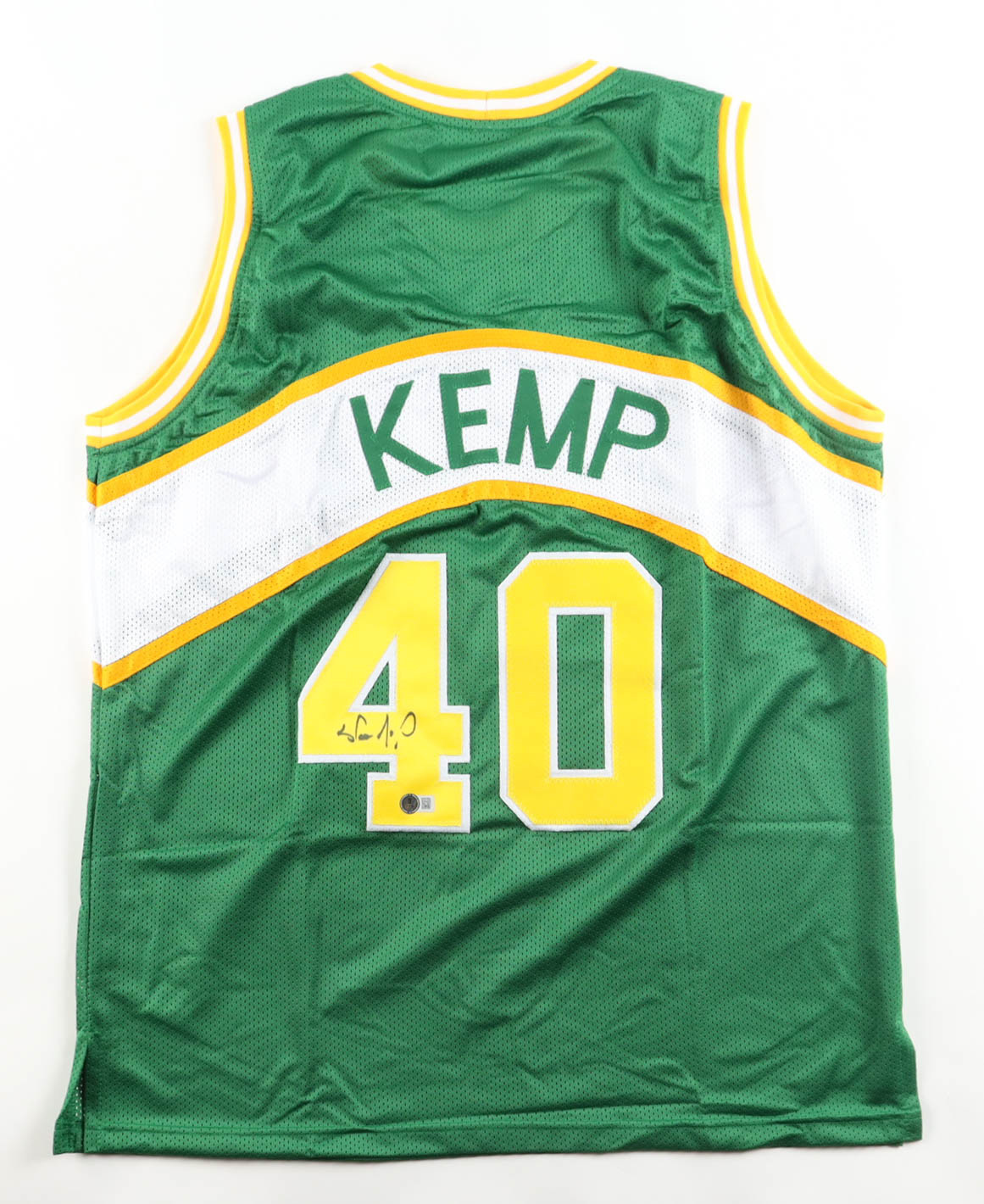 Custom jersey. Everything is sewn on, size XL. Hand-signed by Shawn Kemp. Please note, the signature has bled.