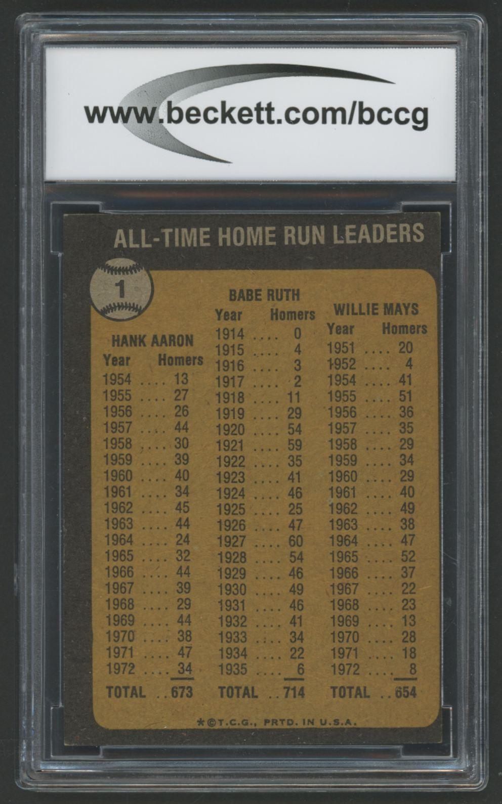 Babe Ruth 714 / Hank Aaron 673 / Willie Mays 654 1973 Topps #1 (BCCG 9)