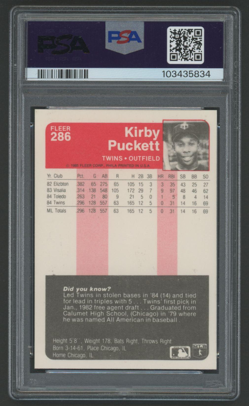Kirby Puckett 1985 Fleer #286 RC (PSA 9)