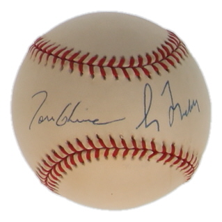 Rawlings Official Major League baseball. Hand-signed by Tom Glavine and Greg Maddux (Atlanta Braves). Please note, the baseball is naturally toned.