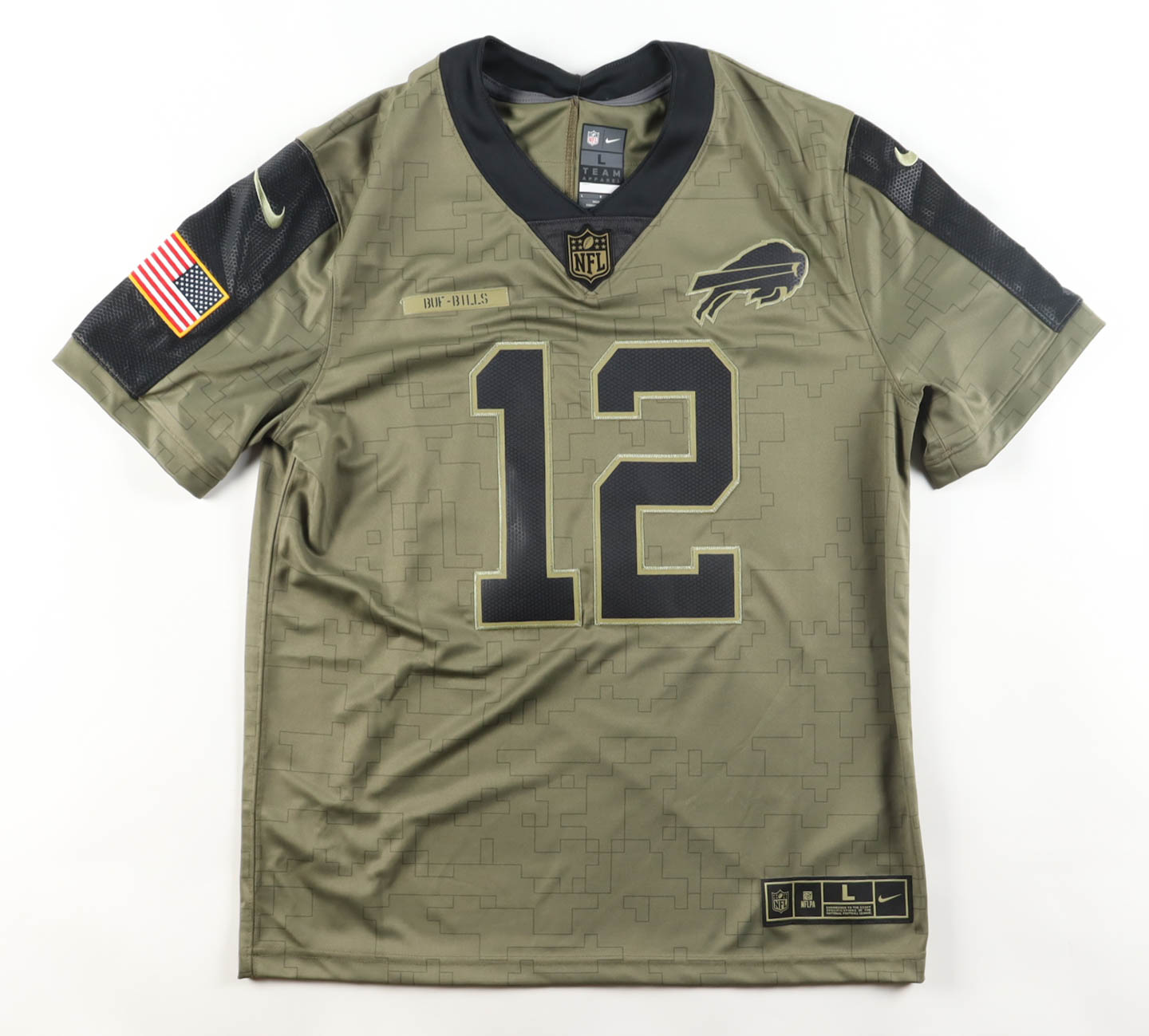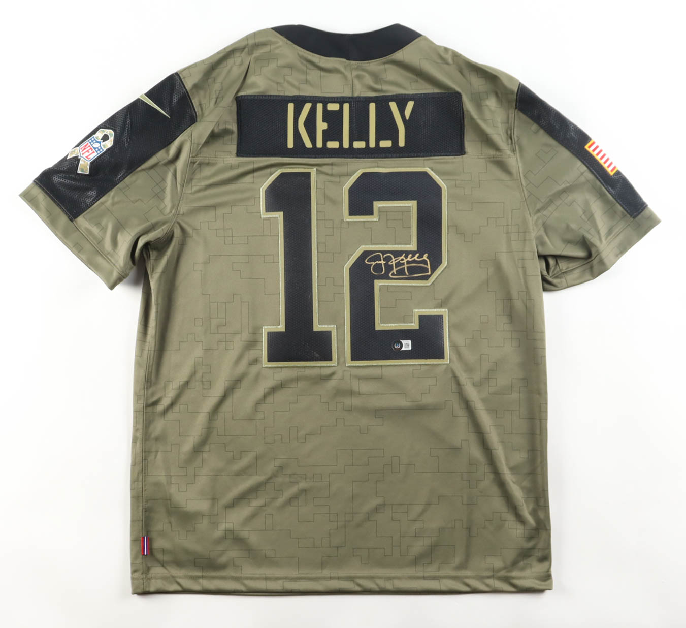 Nike jersey with everything sewn on, size L. Hand-signed by Jim Kelly (Buffalo Bills, HOF).