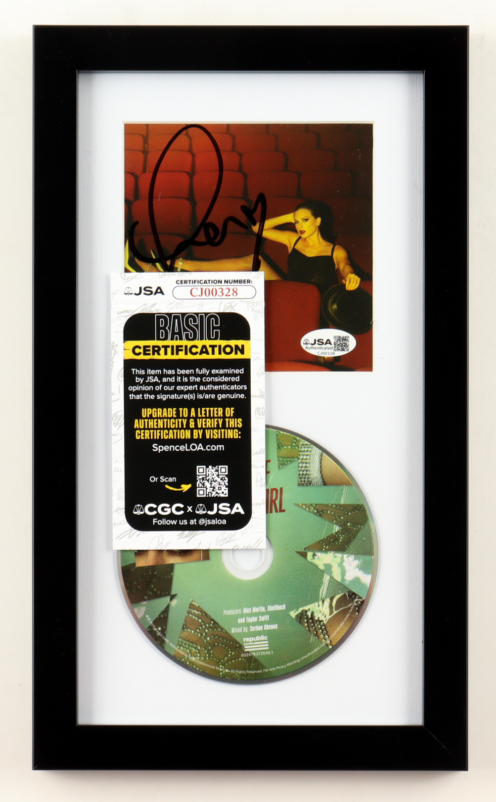 Custom frame measures approximately 8" x 13.5" in size and features a "The Life of a Showgirl" CD insert that has been hand-signed by Taylor Swift. Disc included as shown.