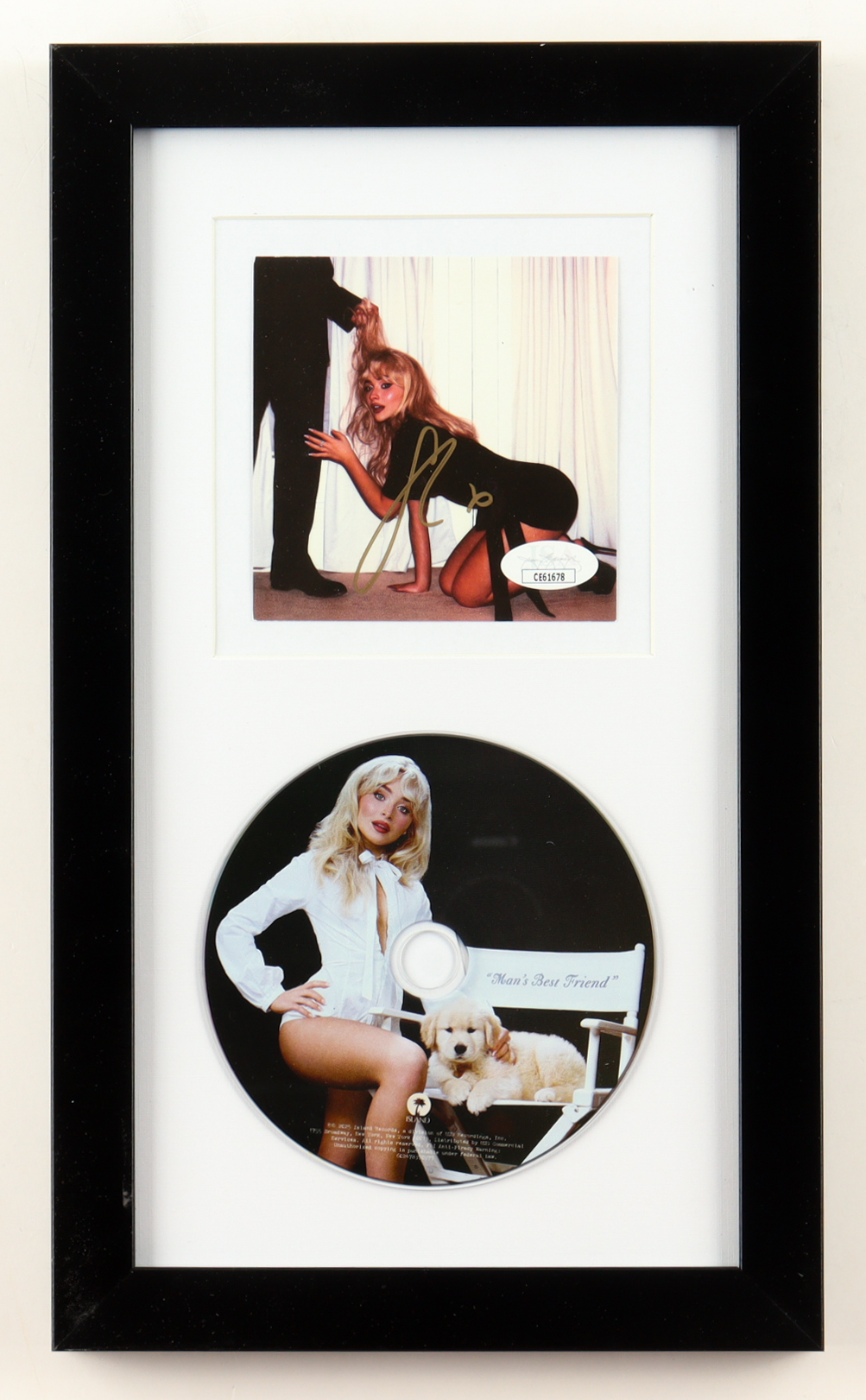 Custom frame measures approximately 8" x 13.5" in size. Features a "Man's Best Friend" CD insert that has been hand-signed by Sabrina Carpenter and includes the disc as shown.